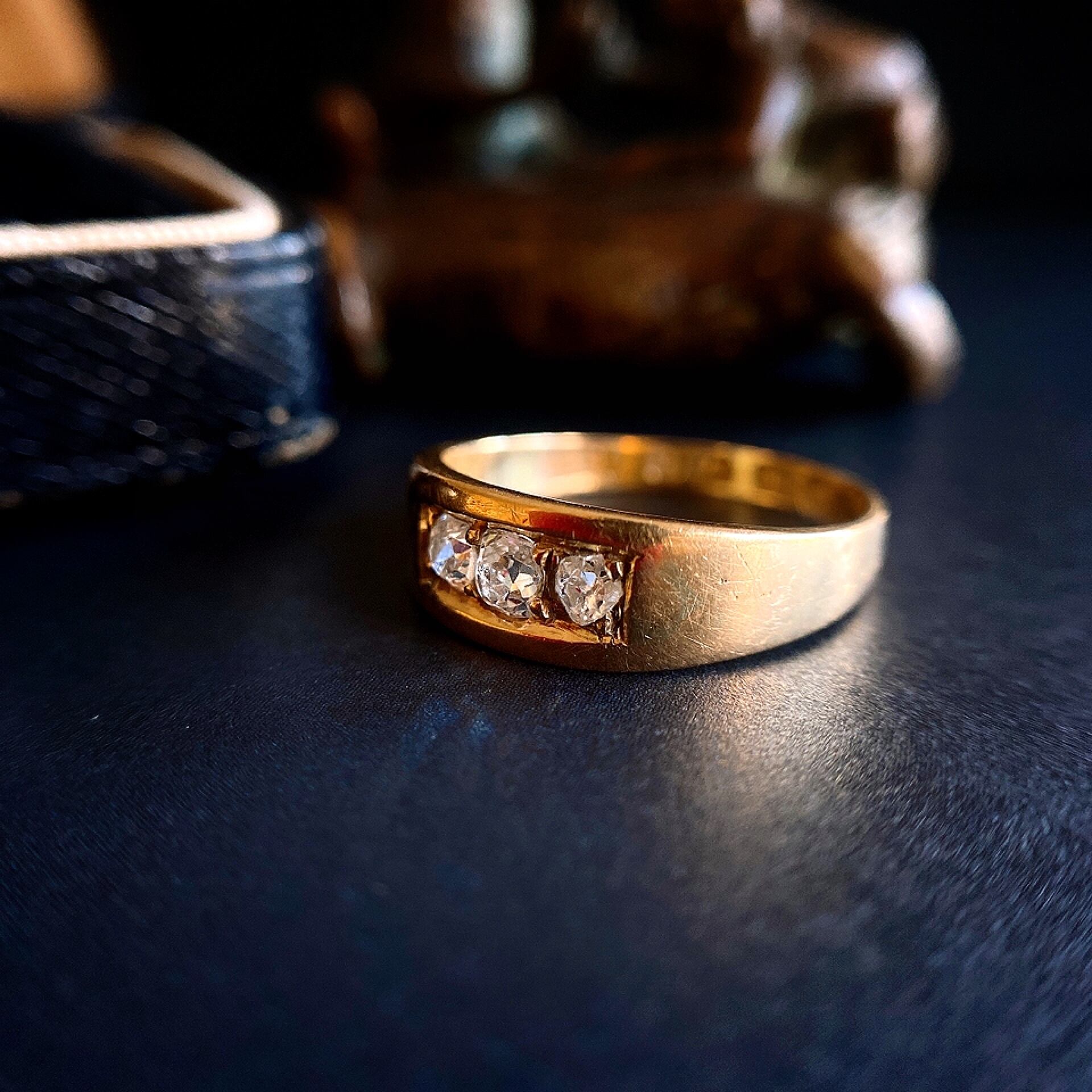 小さいオールドマインカットダイヤモンドが3石寄り添ってセットされたリングはアンティークだけどモダンな雰囲気がとても馴染みやすく重ね付けなどにもぴったりのひと品です。