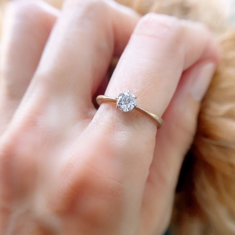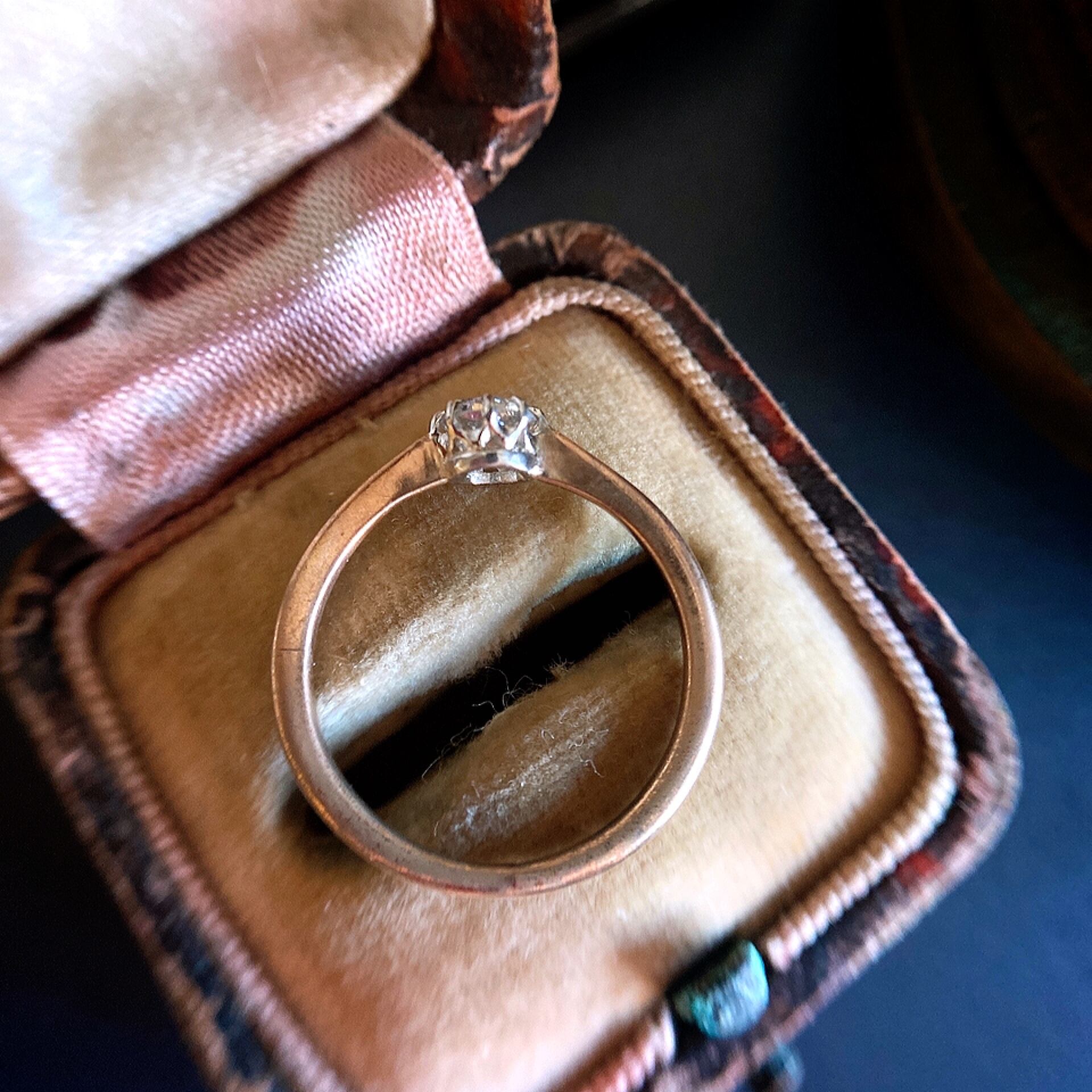 約0.35カラットある一粒を、この上なくシンプルにそしてクラシカルに仕立てたリングは静寂な水面が光輝くようなそんなアンティークダイヤモンドならではの奥行ある煌めきがキラキラと手元で楽しませてくれます。透明感もあり、インクルージョンもほとんどなく、小さくても美しい姿を見せてくれます。