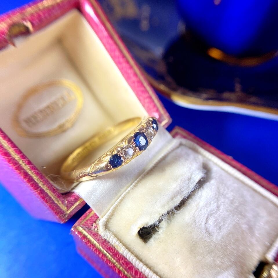 小粒のサファイヤとダイヤモンドを交互に5つ並べ、3石のサファイアはアンティークサファイアらしいディープブルーカラーの物がセットされ、サファイアを引き立てるるようにシングルカットダイヤモンドがセットされた、小さくとも存在感のあるいにしえからの温もりをそっと感じるひと品です。