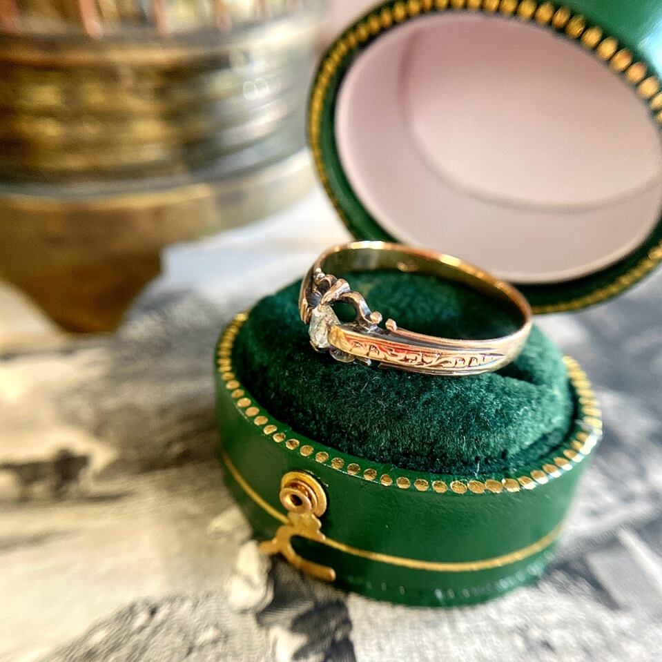 どちらかと言うとピンクゴールドに近い地金のシックな輝きの中央にセットされたダイヤモンドは肉眼ではわからないですが、テーブルカットとオールドマインカットが掛け合わさったような不思議なカットのダイヤモンドがセットされています。そんな所にもアンティークダイヤモンドの進化の過程を垣間見るようで、今では存在しないカッティングにワクワクしてしまいます。