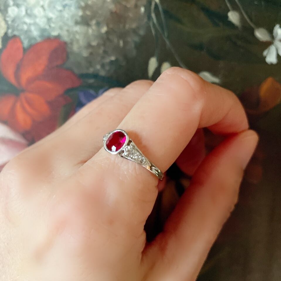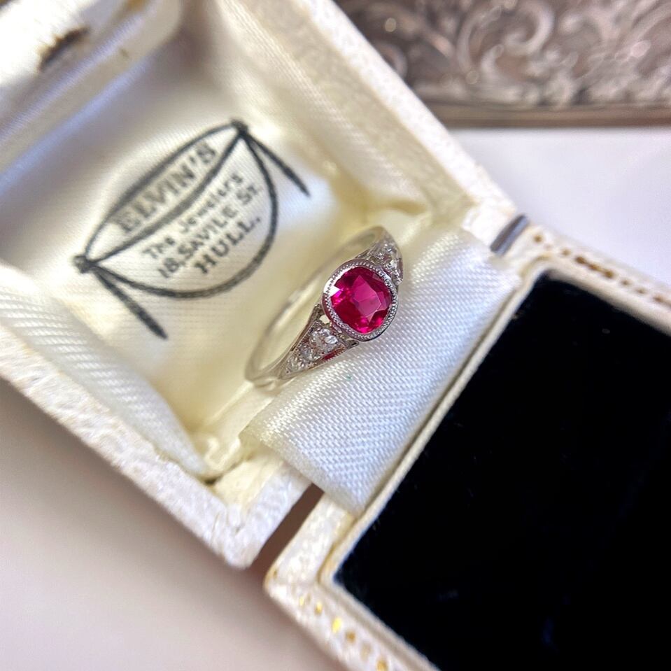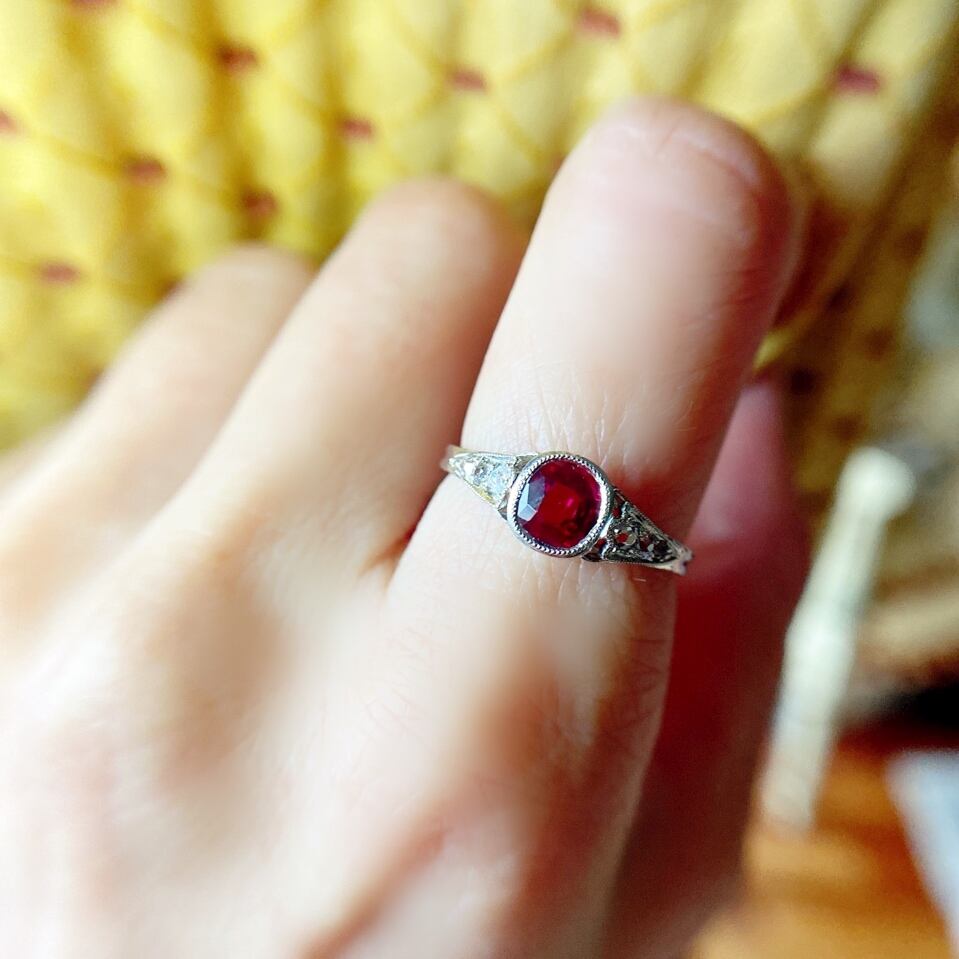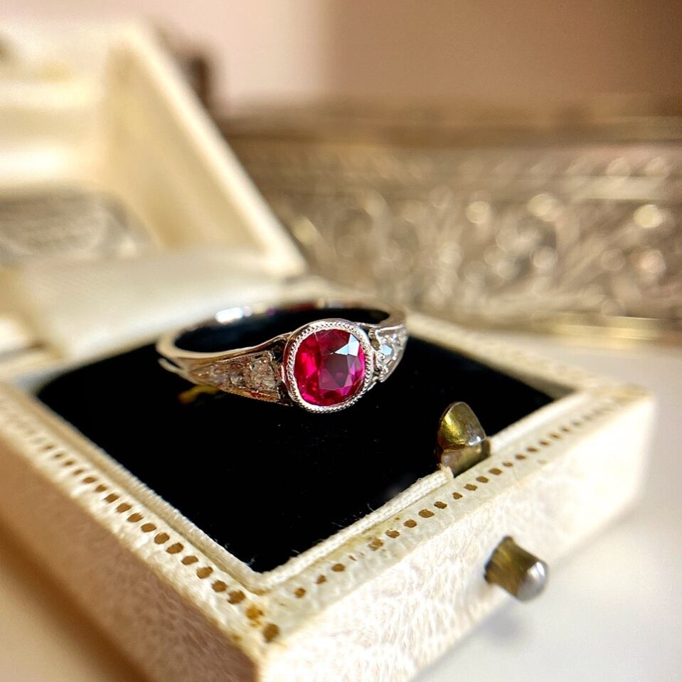 永くご愛用いただけるアールデコのシンプルなデザインだからこそルビーがひときわ際立ち、とても上品な佇まいは、現代物のジュエリーでは成せないですね。
