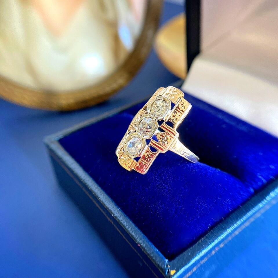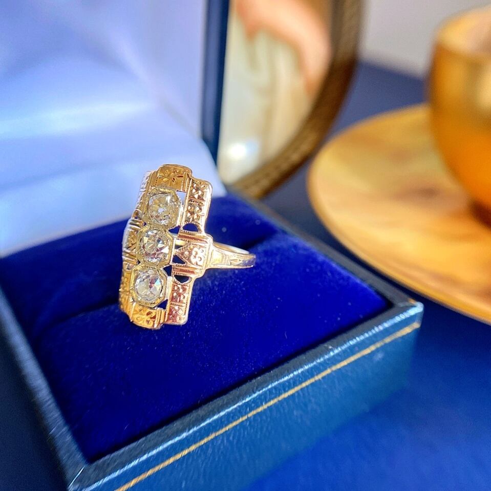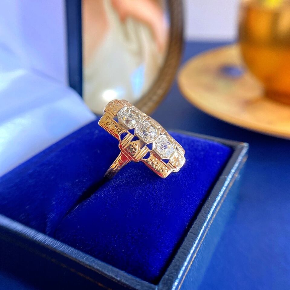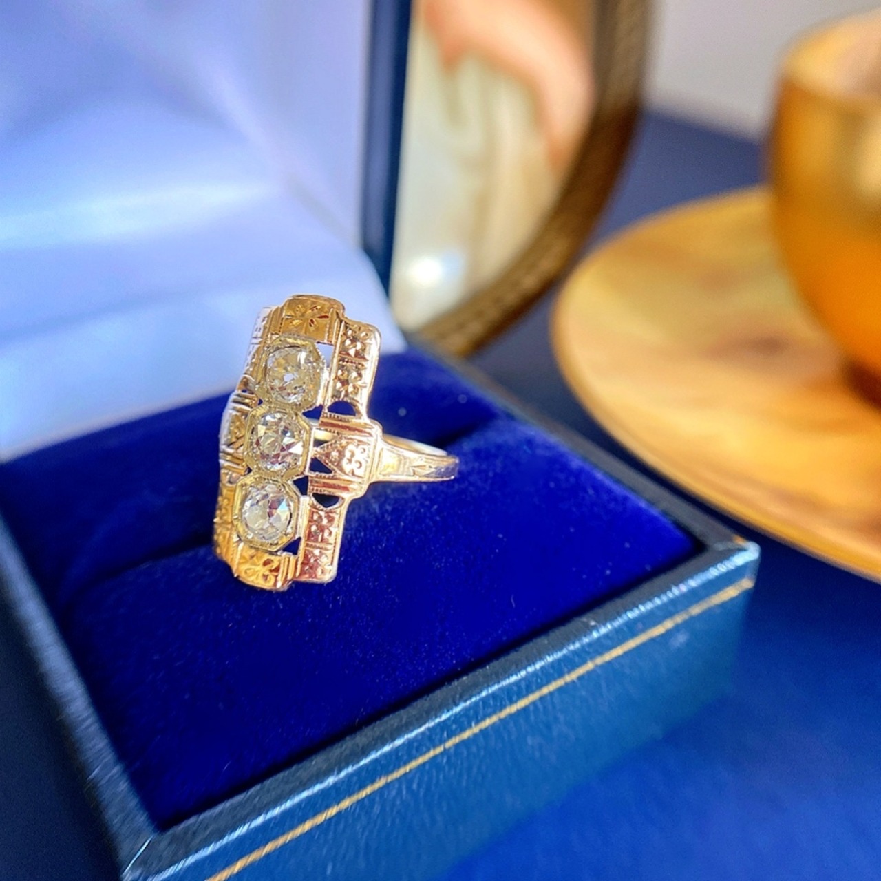 艶感の美しいイエローゴールドの縦長のフェイスにセットされた3石のオールドカットダイヤモンド。