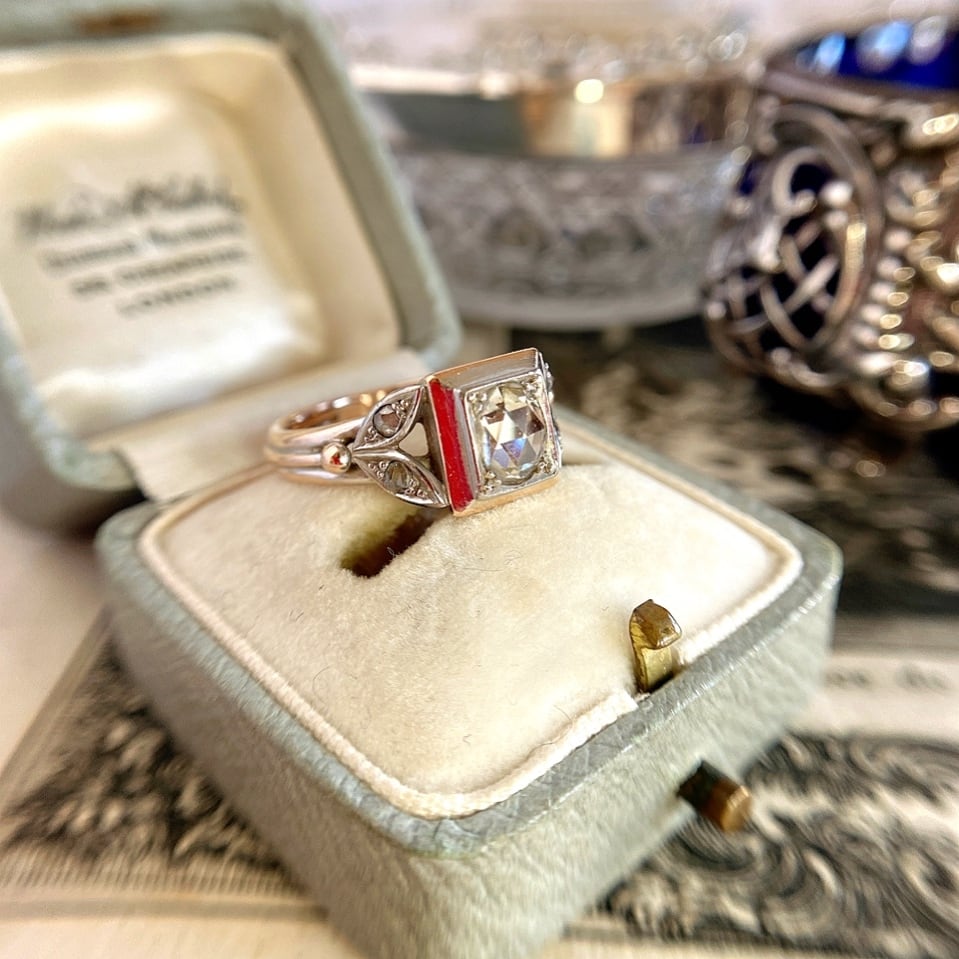 この指輪のようなポストアールデコのデザインのリングは意外と少ないですのでコレクションの一つに加えてみても愉しめるひと品です。