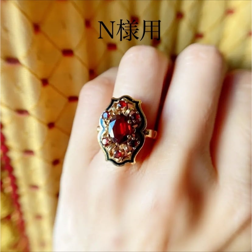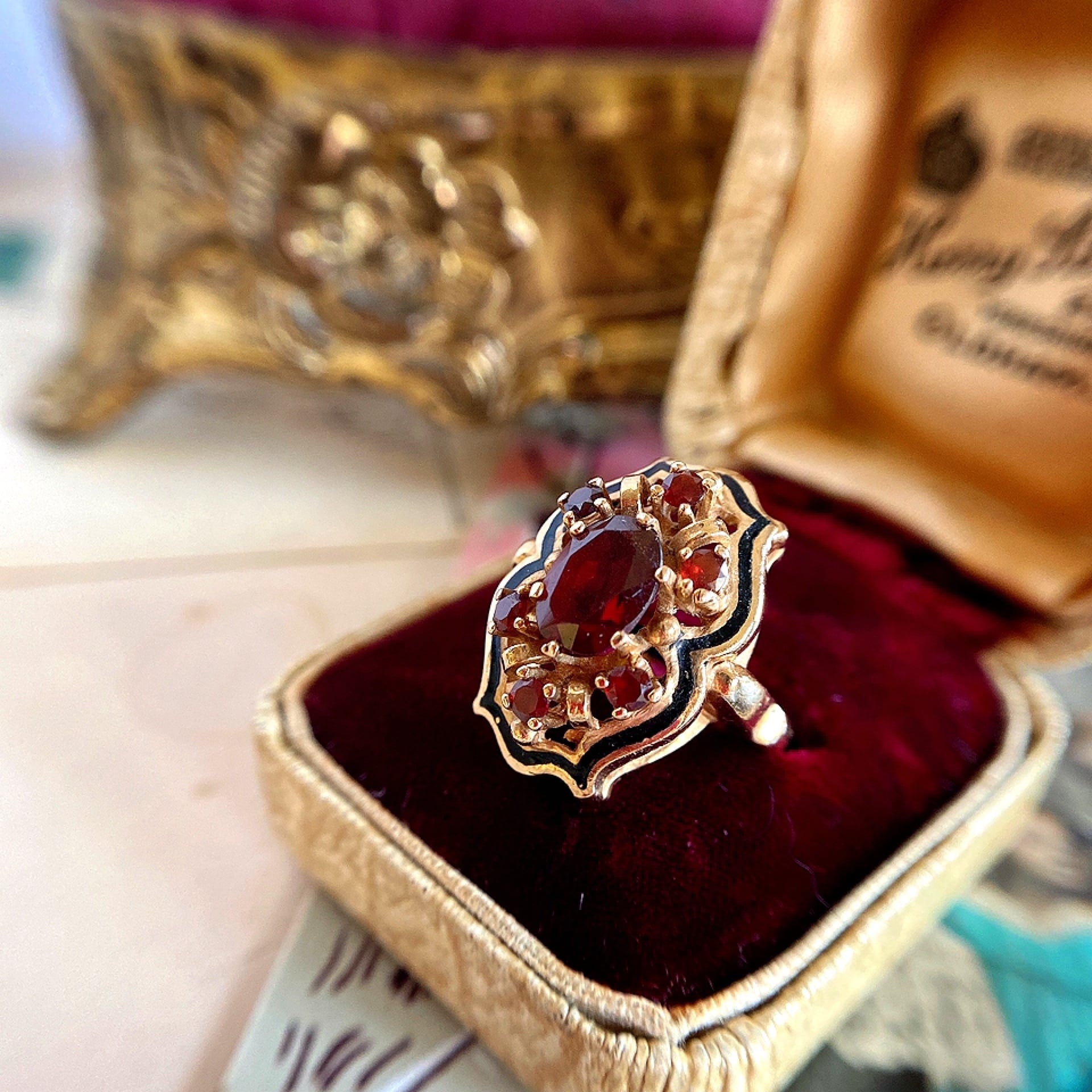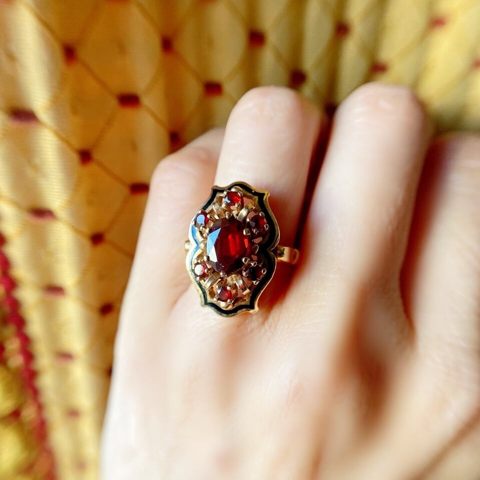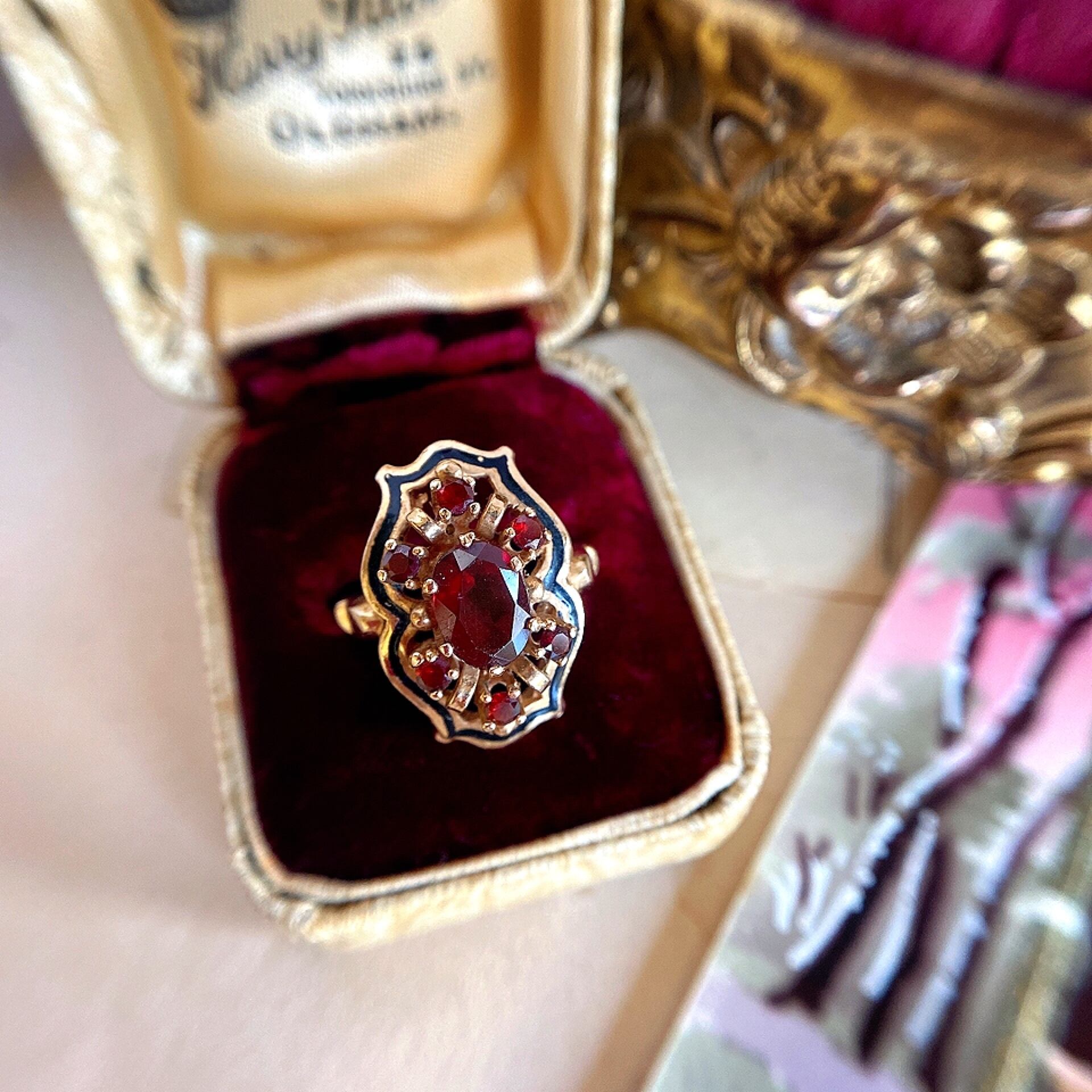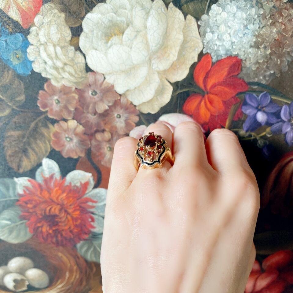 中央に約8.5×6mmのオーバルカットガーネットをセットし、周りに計6粒の約2.5mmのラウンドをセットした縦長のクラスターリングは女性的な柔らかな曲線がとても美しく、縁にブラックエナメルが施され、リングにしまりを与えてくれています。このエナメルかあるかないかでおそらくだいぶ印象が違った事でしょう。