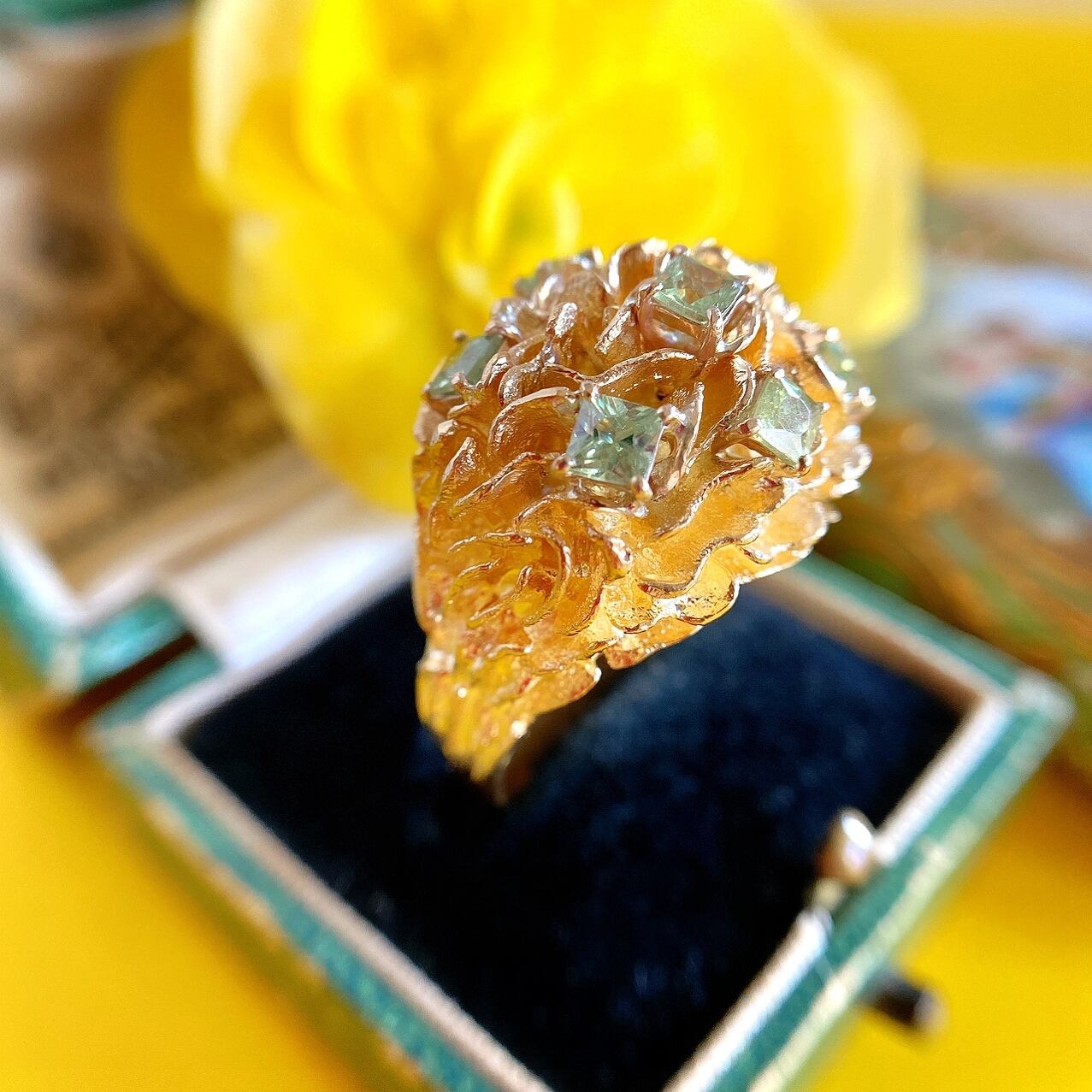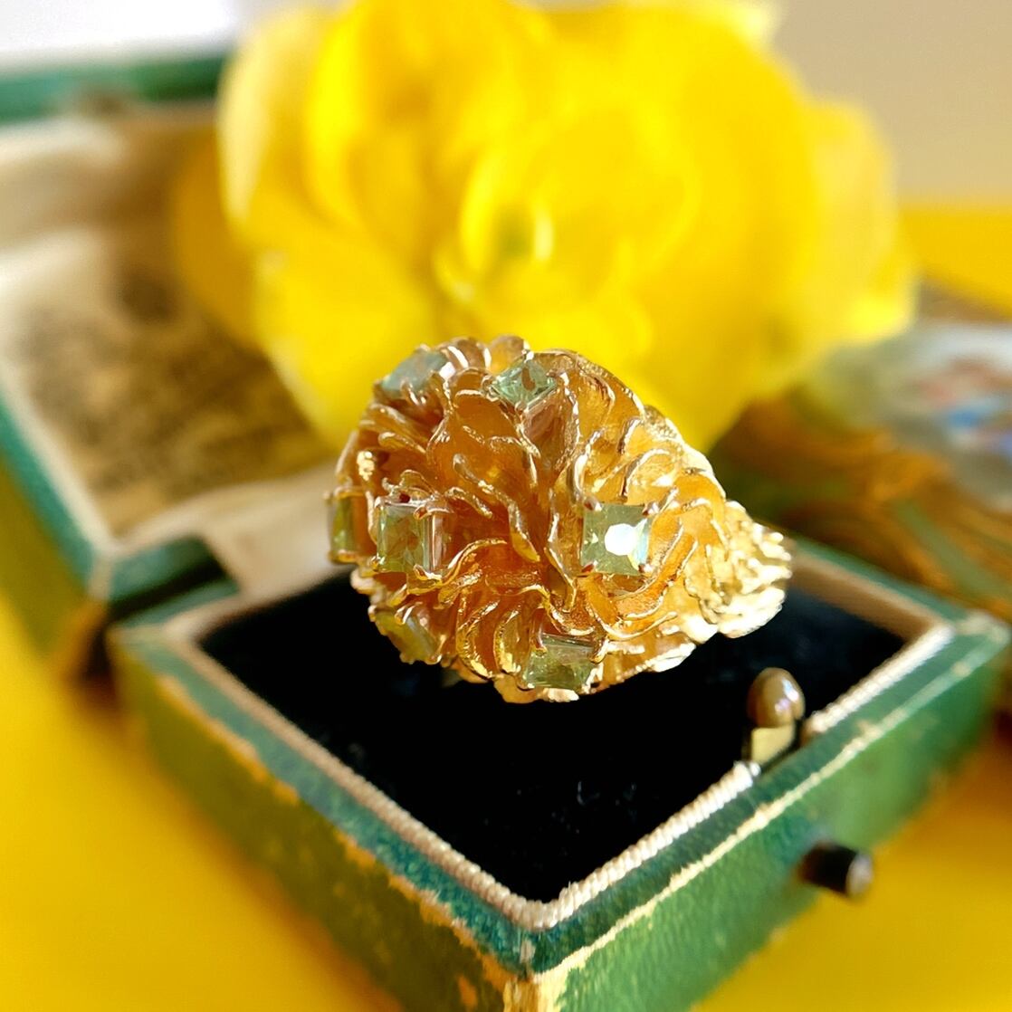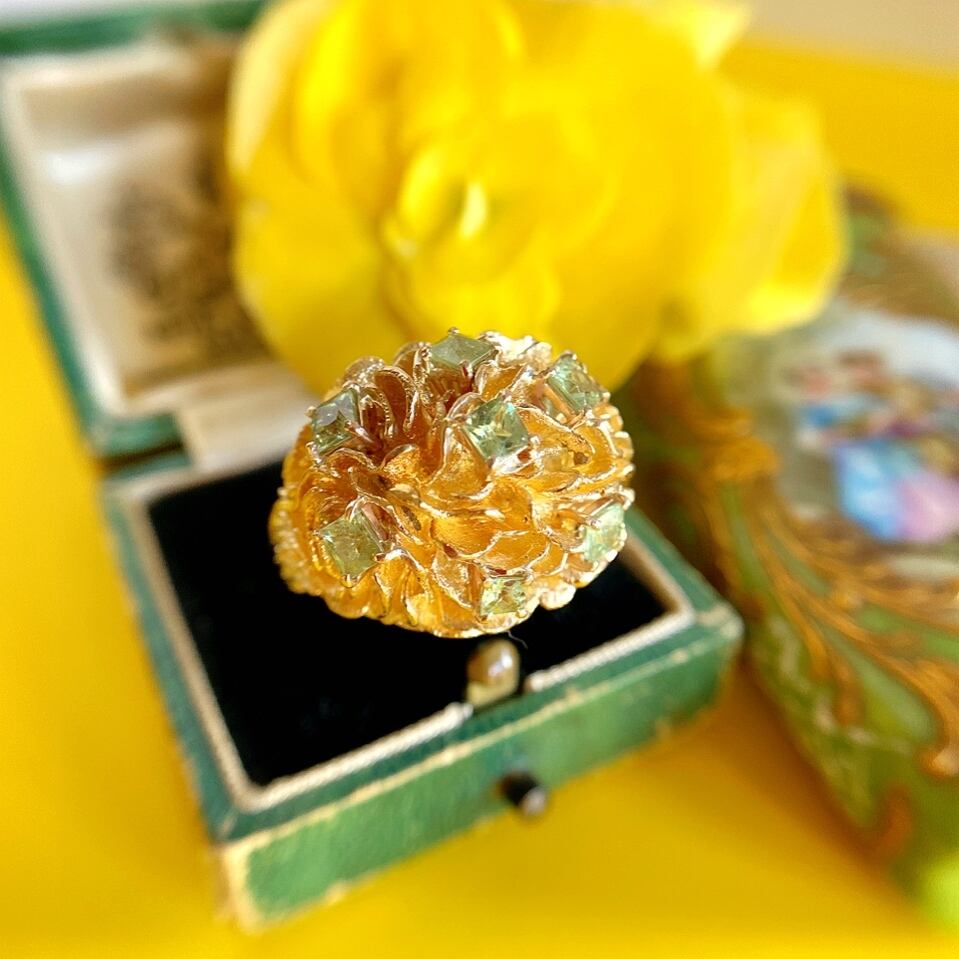 半球状のコロンと盛り上がった斬新なデザインの1940年代頃のボンブリングですが、ただのボンブ型ではなく表面に幾重にも重なる花弁に見立てた金の花弁のデザインがまるでカーネーションのブーケのような美しさを感じる珍しいつくりのひと品です。