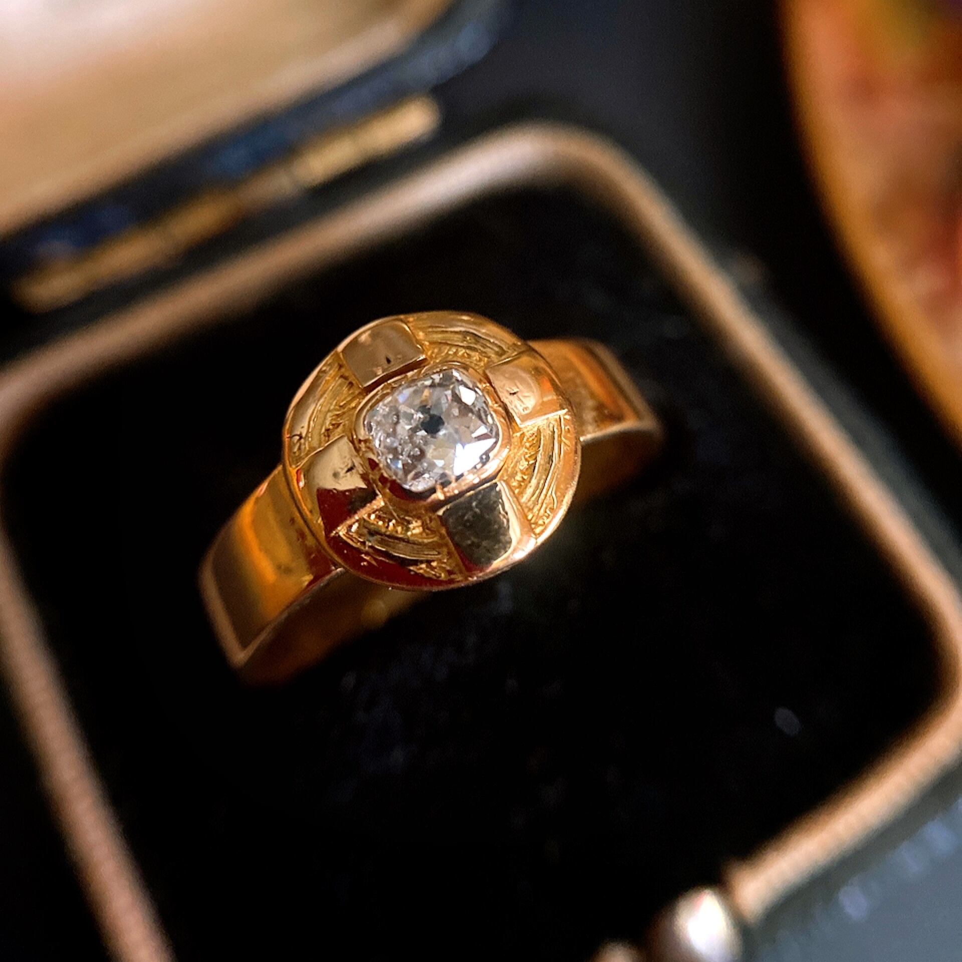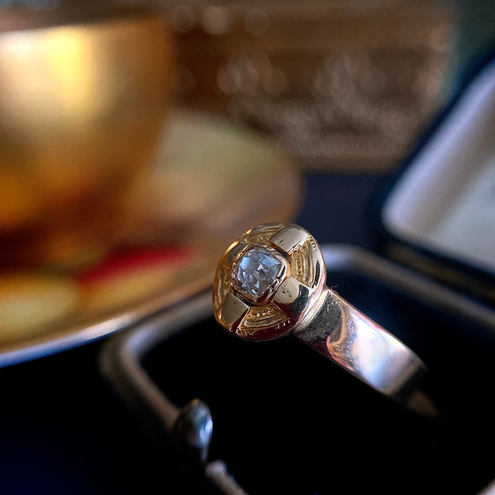 イエローゴールドのサークルのフェイスの中央にウルウルと輝くオールドマインカットダイヤモンド。