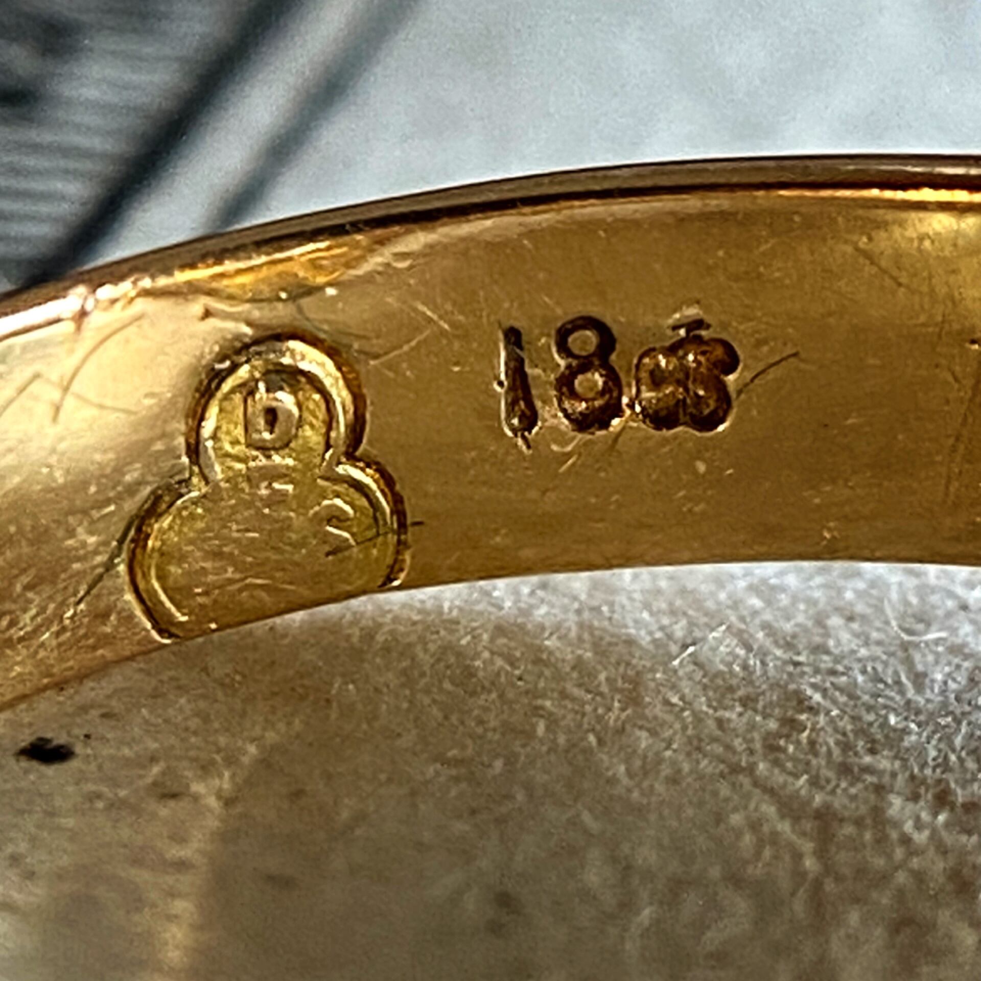 横と縦の長さが同じギリシア十字架のような部分は浮き彫りになっていて、フラットな部分には直線的な模様が彫られています。そのため同じイエローゴールドでも艶がある部分と艶がない部分ができ、同じ素材でも陰影が出来る事で立体感とメリハリがうまれます。