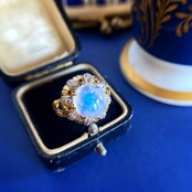 カボションカットのムーンストーンの厚みと照りはまるで光をギュッと閉じ込めたしずくのように妖艶に輝き、4大宝石(ダイヤモンド、サファイア、ルビー、エメラルド)ほどの存在感ほどはないだろうと・・と思いきや、