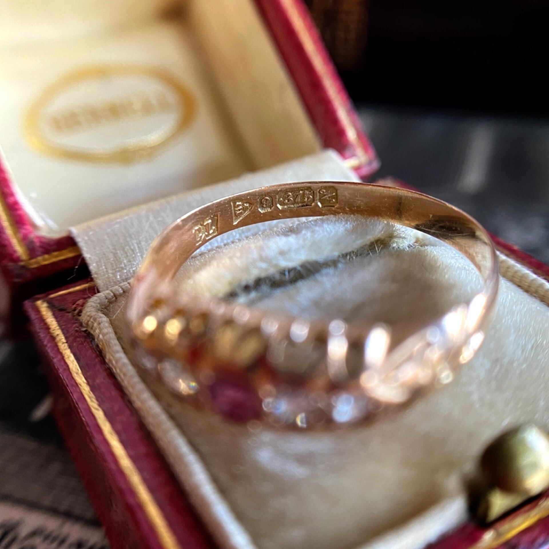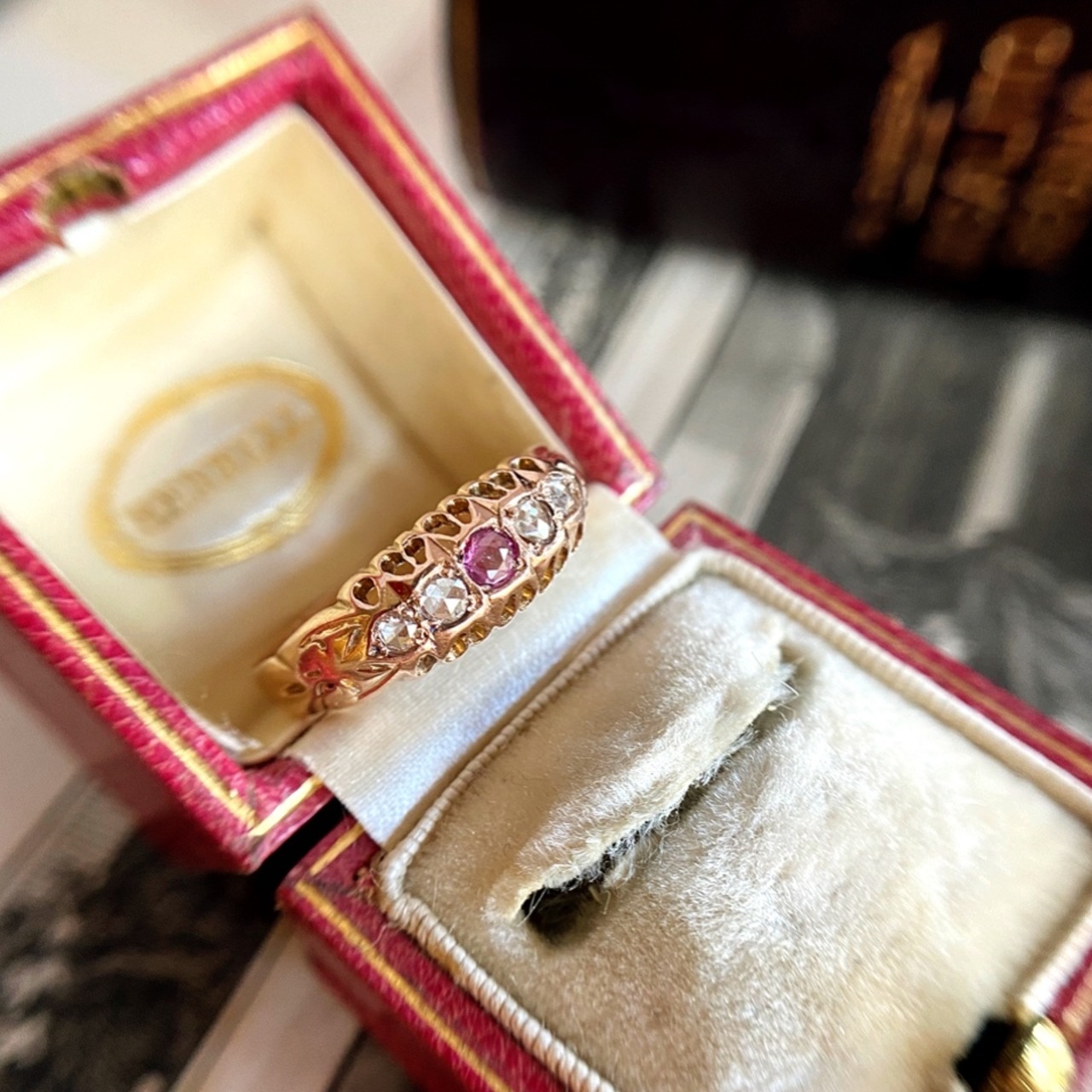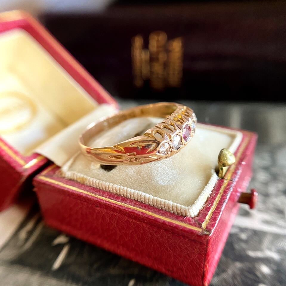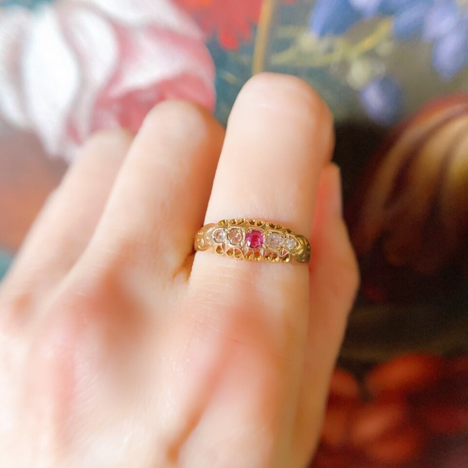艶感のあるローズゴールドのシャンク、その台座は光を多く取り込めるように雫型の細工が施され、遠い夜空の星の瞬きが指元に舞い降りてきたような優しい煌めきにあたたかみを感じるエドワーディアンリング。