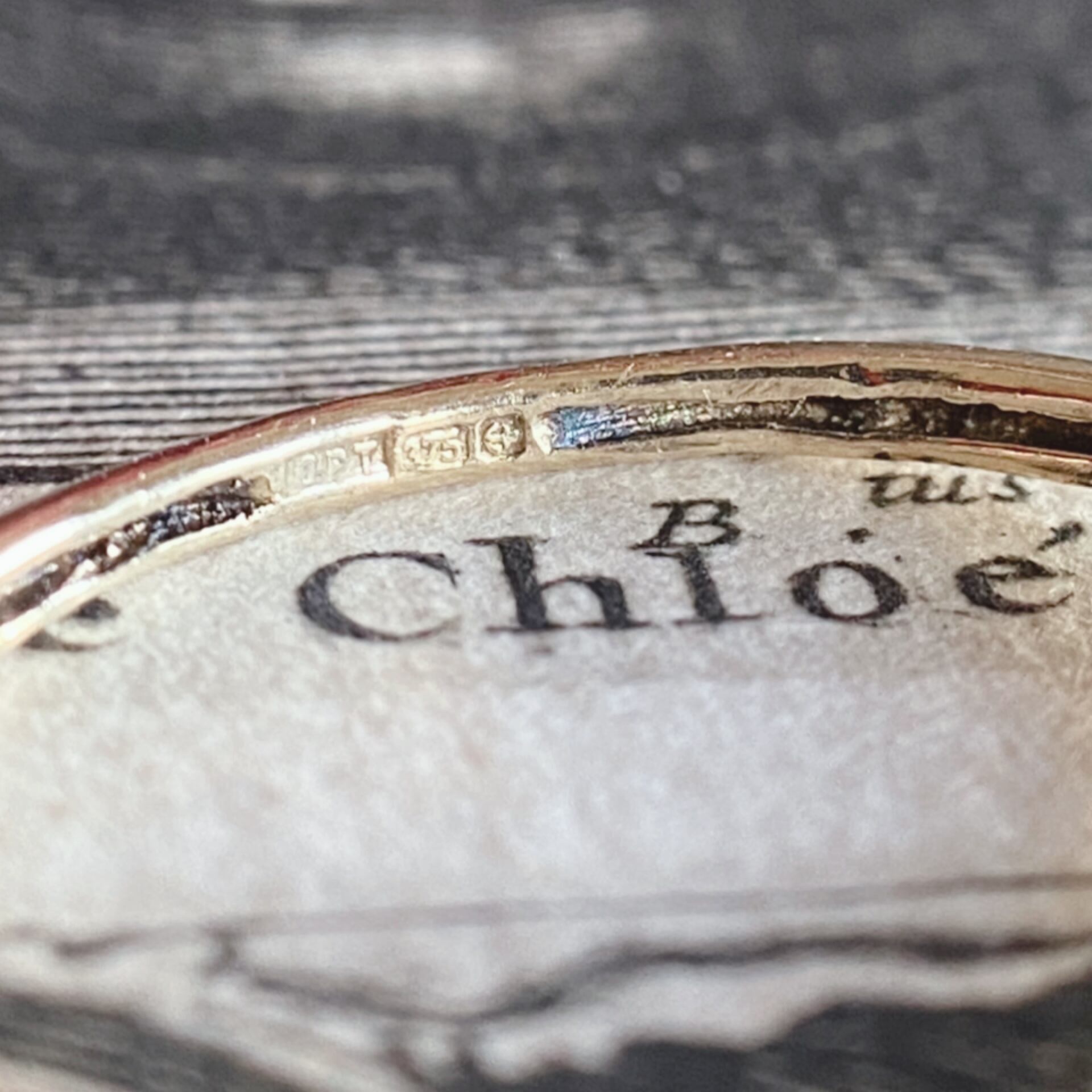 石を支えている爪を横から見ますと、片側から高く持ち上げるような流れる曲線を描く凝った作りになっていて、シンプルながらも見えないところが凝った作りになっているのがアールデコらしい要素の一つでもあると感じます。