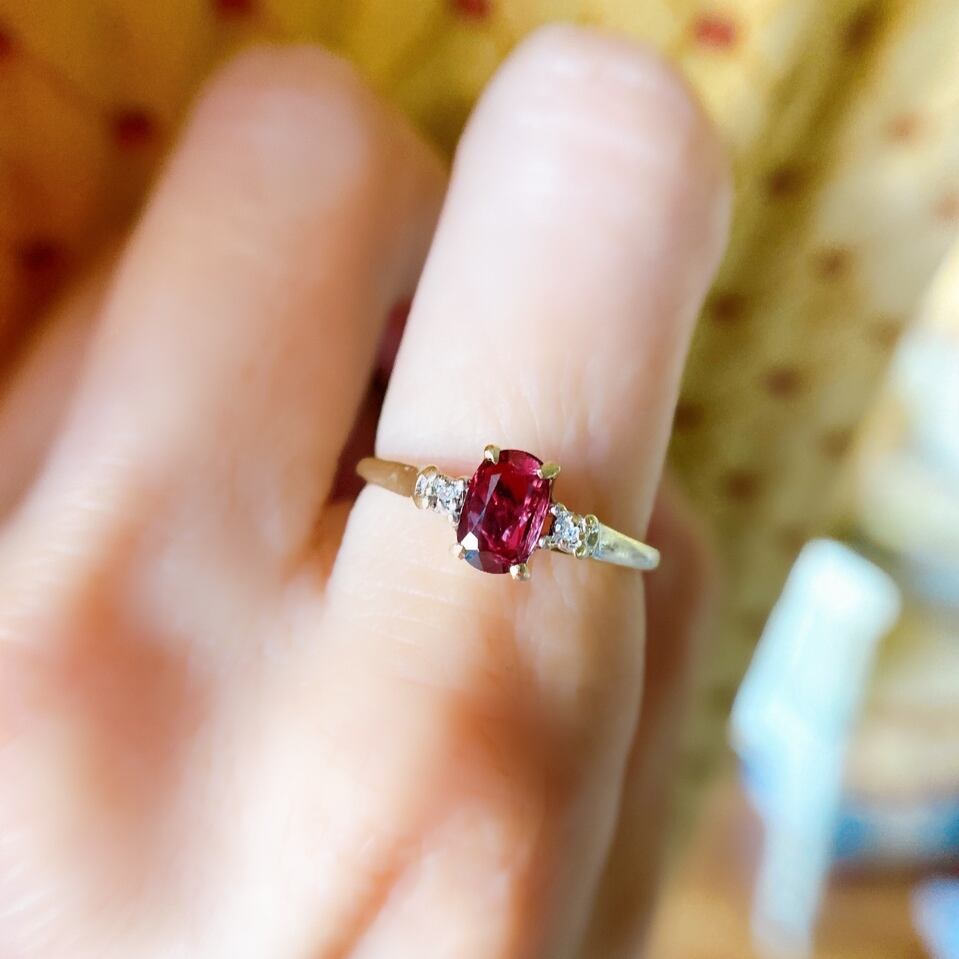 中央に6×4mm程のオーバルカットされた透明感のある透き通った石をセットし、そのサイドにはさり気なくシングルカットダイヤモンドがセットされて、ダイヤモンドの部分のみプラチナの地金を使ってます。