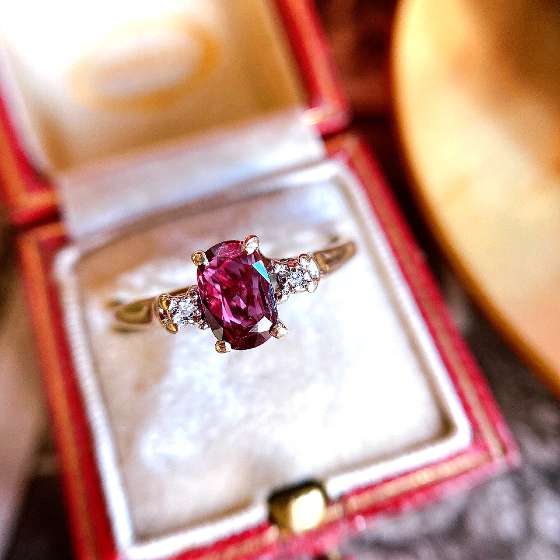 一切凝った装飾のないこの上なくシンプルなデザインの台座にセットされているからこそ赤紫色のピンクトルマリンだけの美しさに目が奪われる作りになっているリング。
