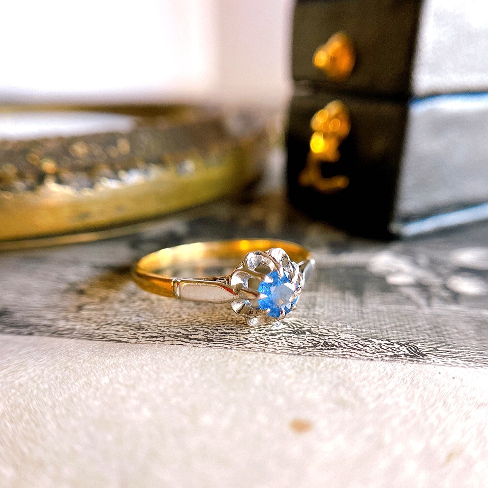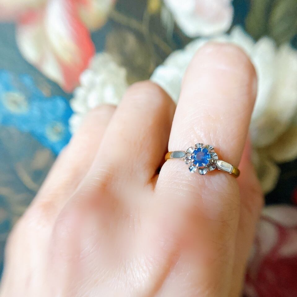 19世紀末から20世紀初頭のターンオブザセンチュリーにイギリスやフランスで流行したセッティング方法の一つですが、この度のリングは、プラチナの台座に透明感のある美しいブルーサファイアをそっと一粒セットした、可愛いらしさの中に大人なクールさを感じるバター