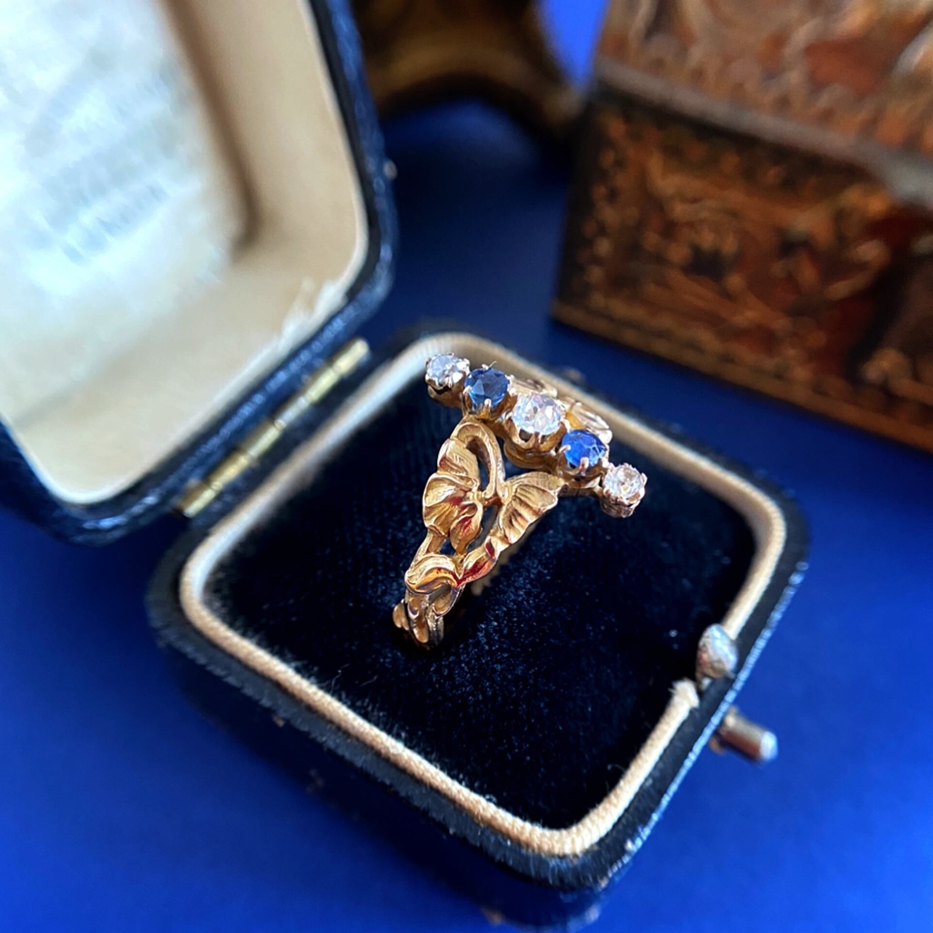 ラウンドカットのサファイアは、自然な深みのあるきれいな青で、ダイヤモンドはそれぞれ小さくとも透明感のあるオールドマインカットの物がセットされています。