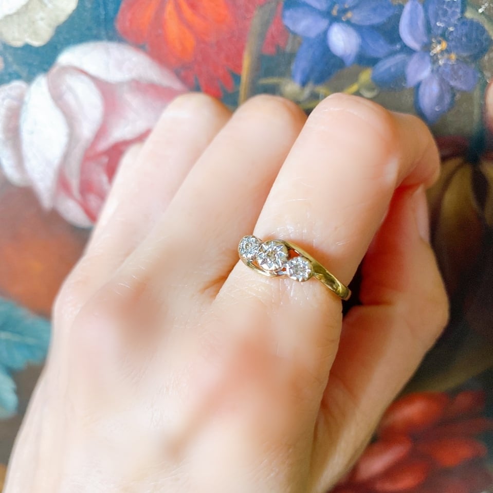 アームから台座に向けてしなやかに流れる曲線に包み込まれるようにして3粒のダイヤモンドがセットされたクロスオーバーのトリロジーリング。