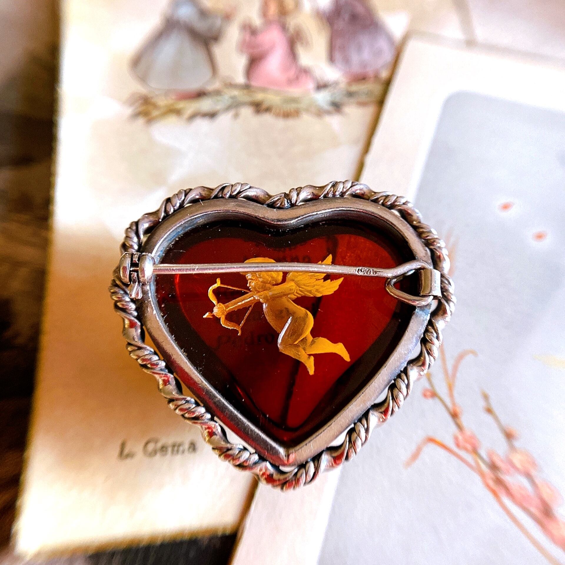 ロープツイストの可愛いハート型ののスターリングシルバーの枠にぷっくりとした厚み、そして透明感のあるコニャク色をしたハート型の天然琥珀をセットした可愛すぎる位可愛いヴィンテージブローチ。