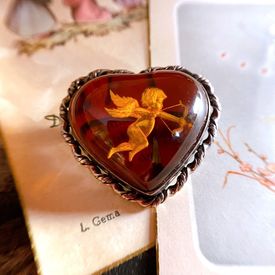 ブローチの中に浮かぶのは愛のキューピット。今まさに弓をいる瞬間を捉えた情景に私が心を奪われてしまいそうです。