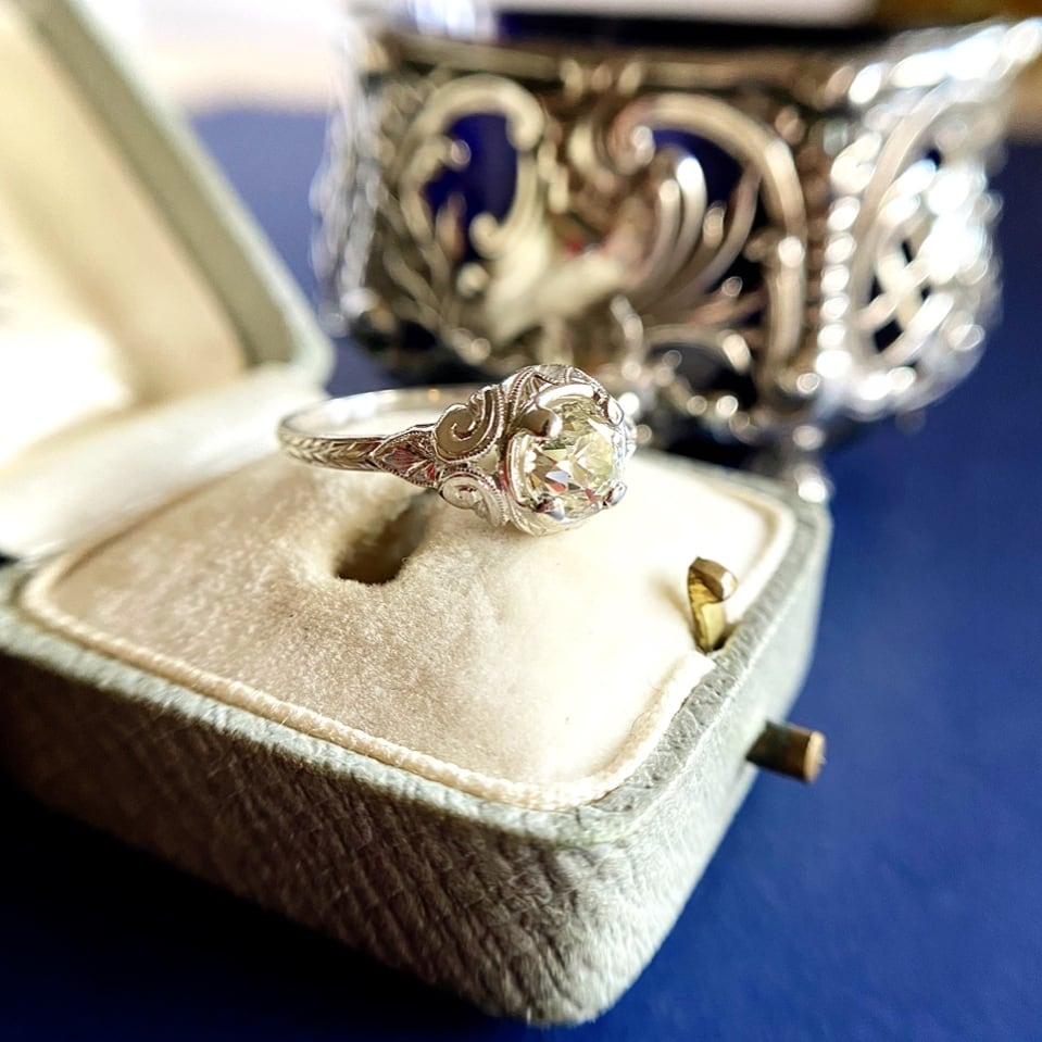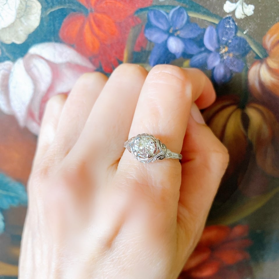 春を待ち侘びた花々が一気に輝かしい花々を咲かせるように、透かしデザインがさり気なく施されたフェミニンなデザインの台座から顔を出すダイヤモンドは、アンティークダイヤモンド特有の厚みもあり、透明度も高く、肉眼でわかるようなインクルージョンもない美しい子です。