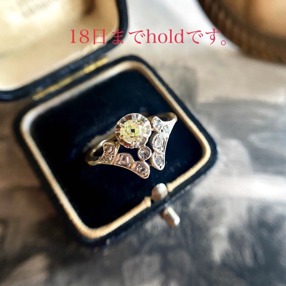 イエローゴールドのシャンクとプラチナのフェイス、そしてアールデコらしいシャープな型、でもアールデコ特有のクールなそれとは違う、優しい暖かみを感じるフェミニンなリングです。