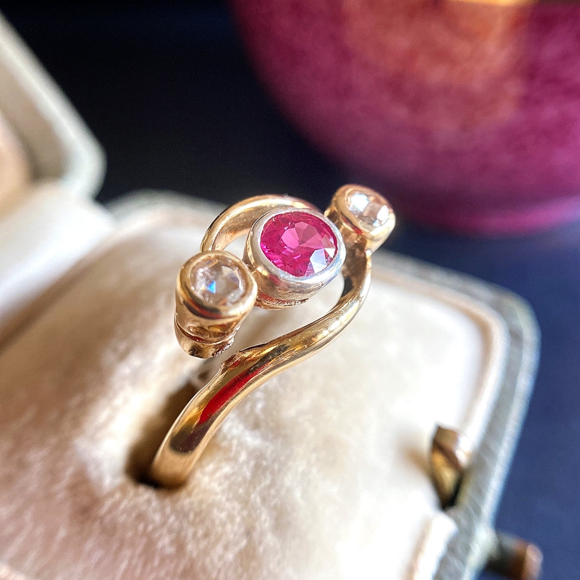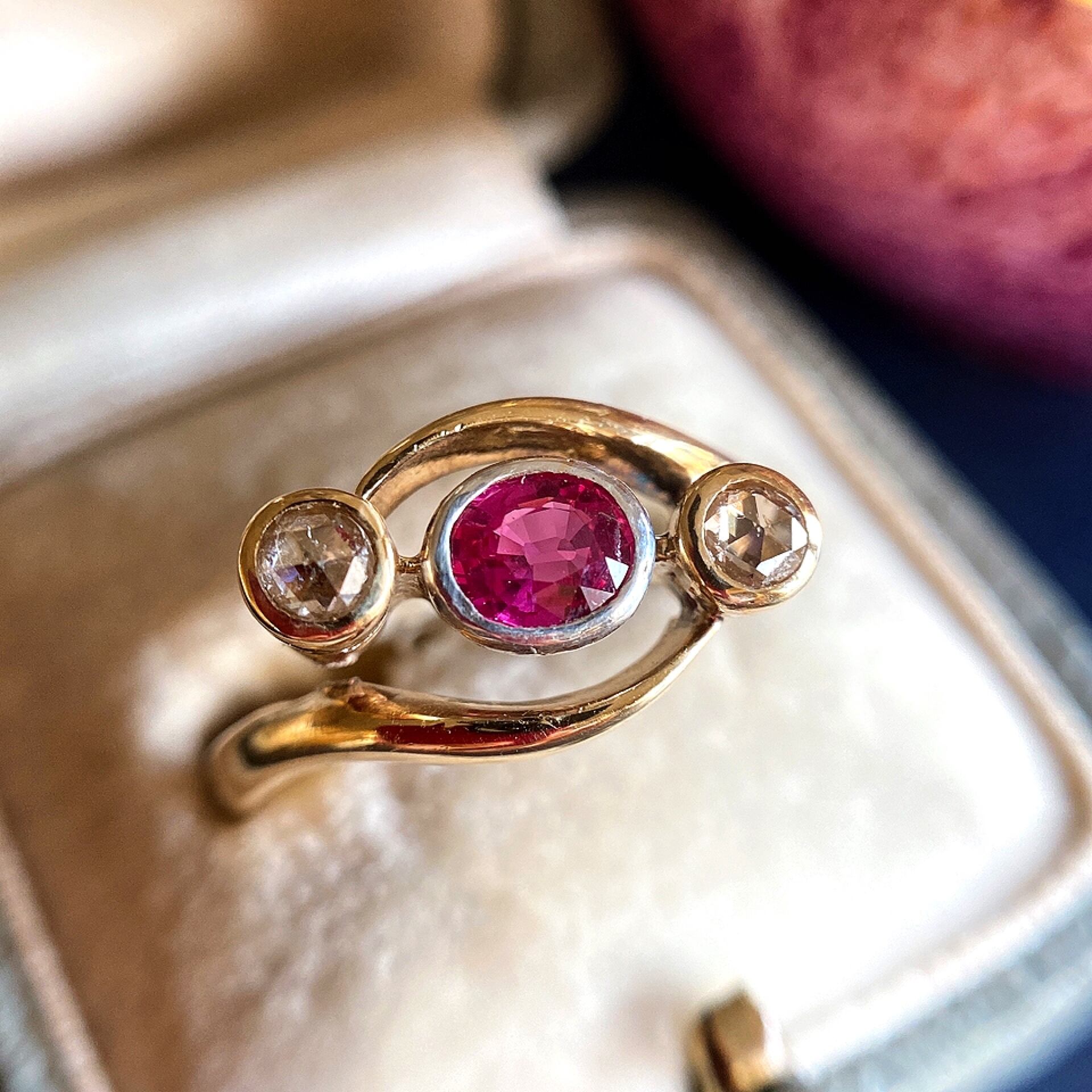 鮮烈なまでのビビットなピンク色が魅惑的な非加熱ルビーを中央にセットしその両隣には野薔薇を思わす小さな佇まいのローズカットダイヤモンドがセットされています。石は全て爪止めではなくルース1つ1つを囲う覆輪留めという技法でセットされている所も素敵ですね。