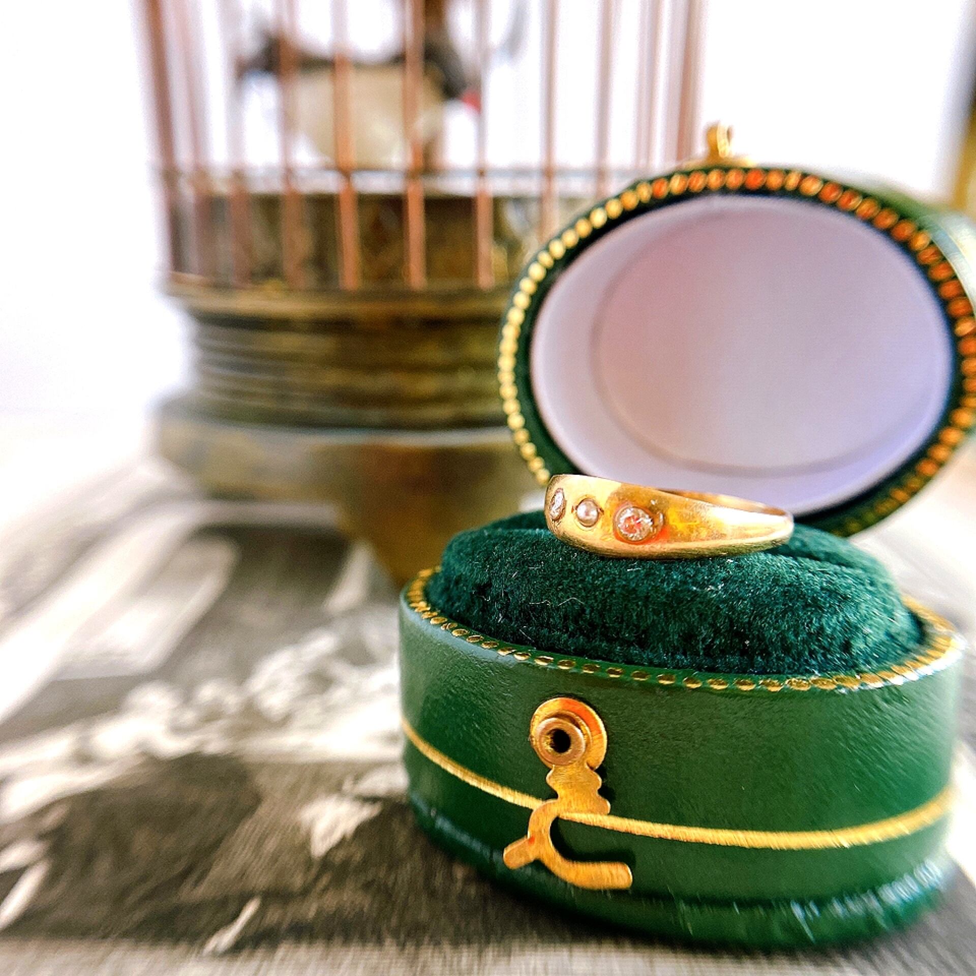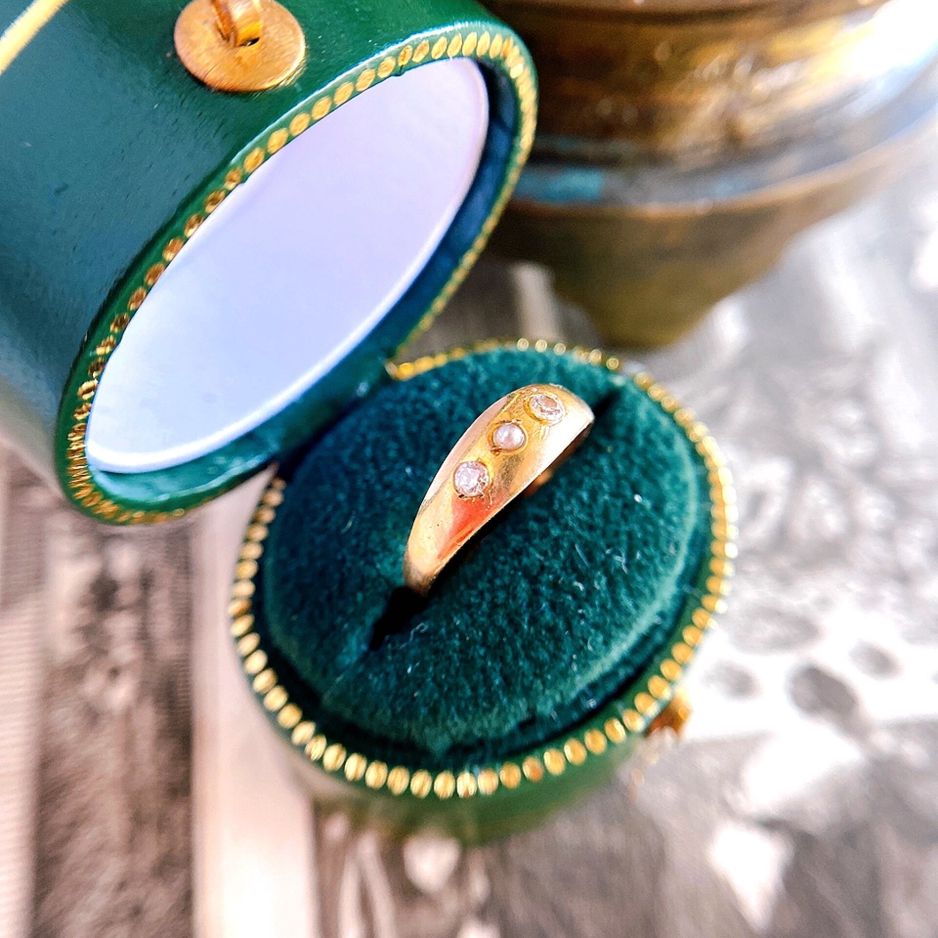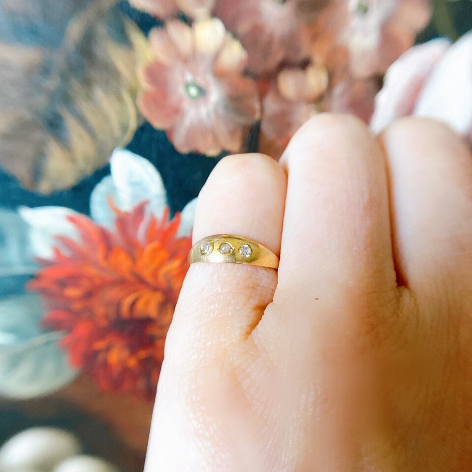 静かに輝く星のような優しいぬくもりを感じるリングは中央に小さなハーフパールをそえ、その両隣には小さなダイヤモンド2粒、14kゴールドのなめらかなテクスチャーの中で優しい煌めきを放っています。