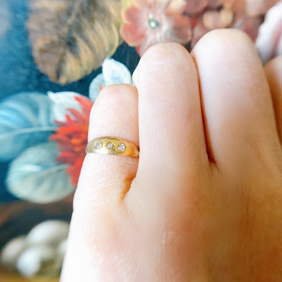 全く飾り気のないシャンクだからこそゴールドのこっくりとした輝きを感じ、ダイヤモンドとパールを凛と輝かせてくれるピンキーリング。