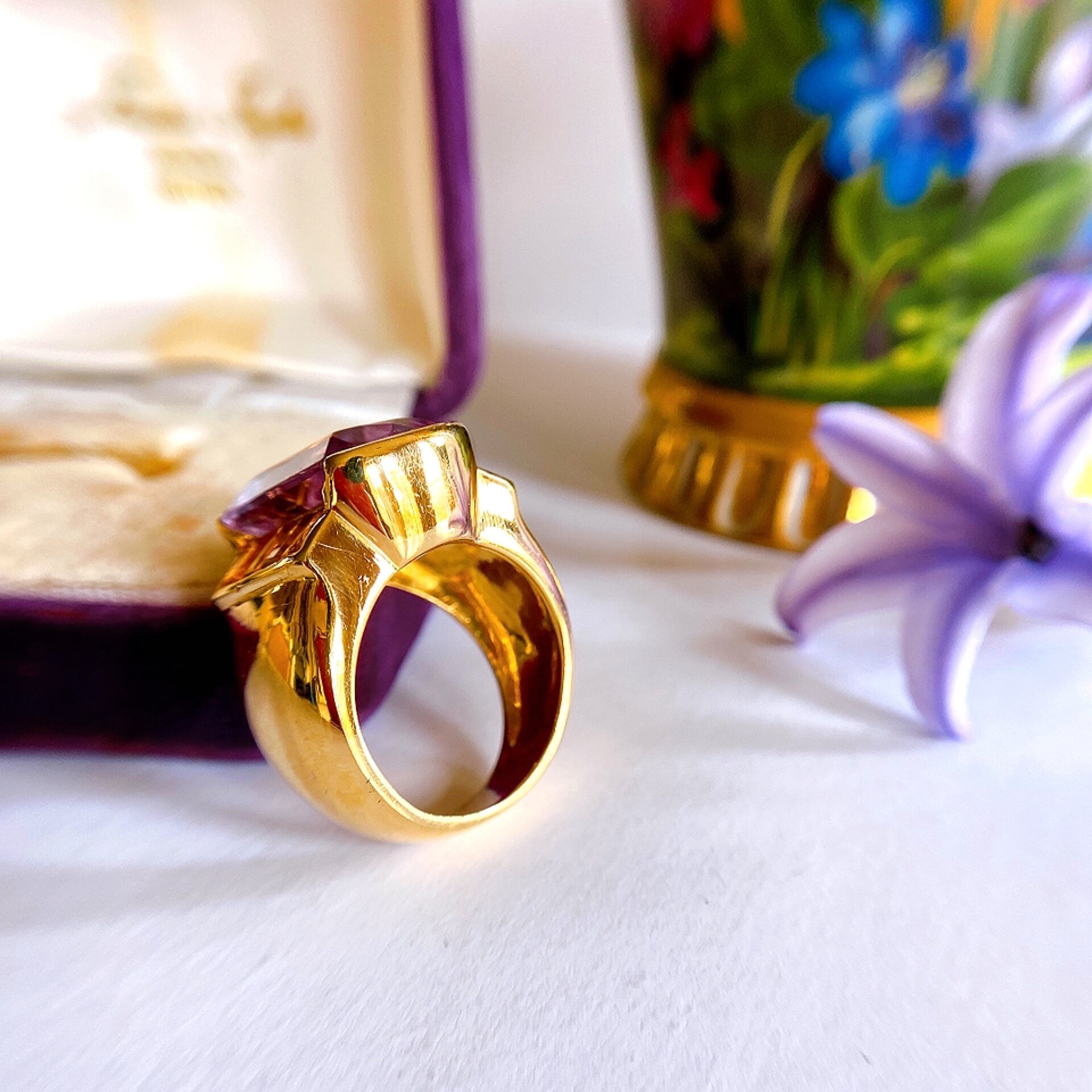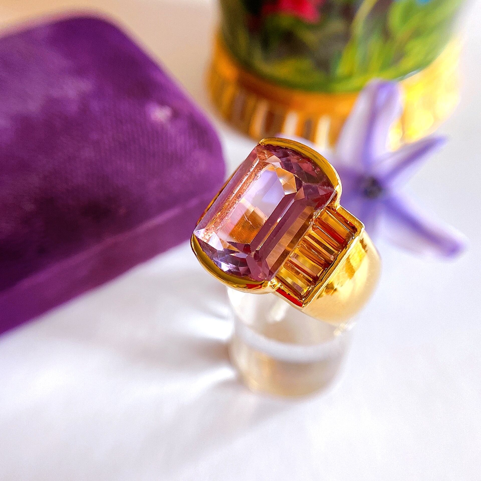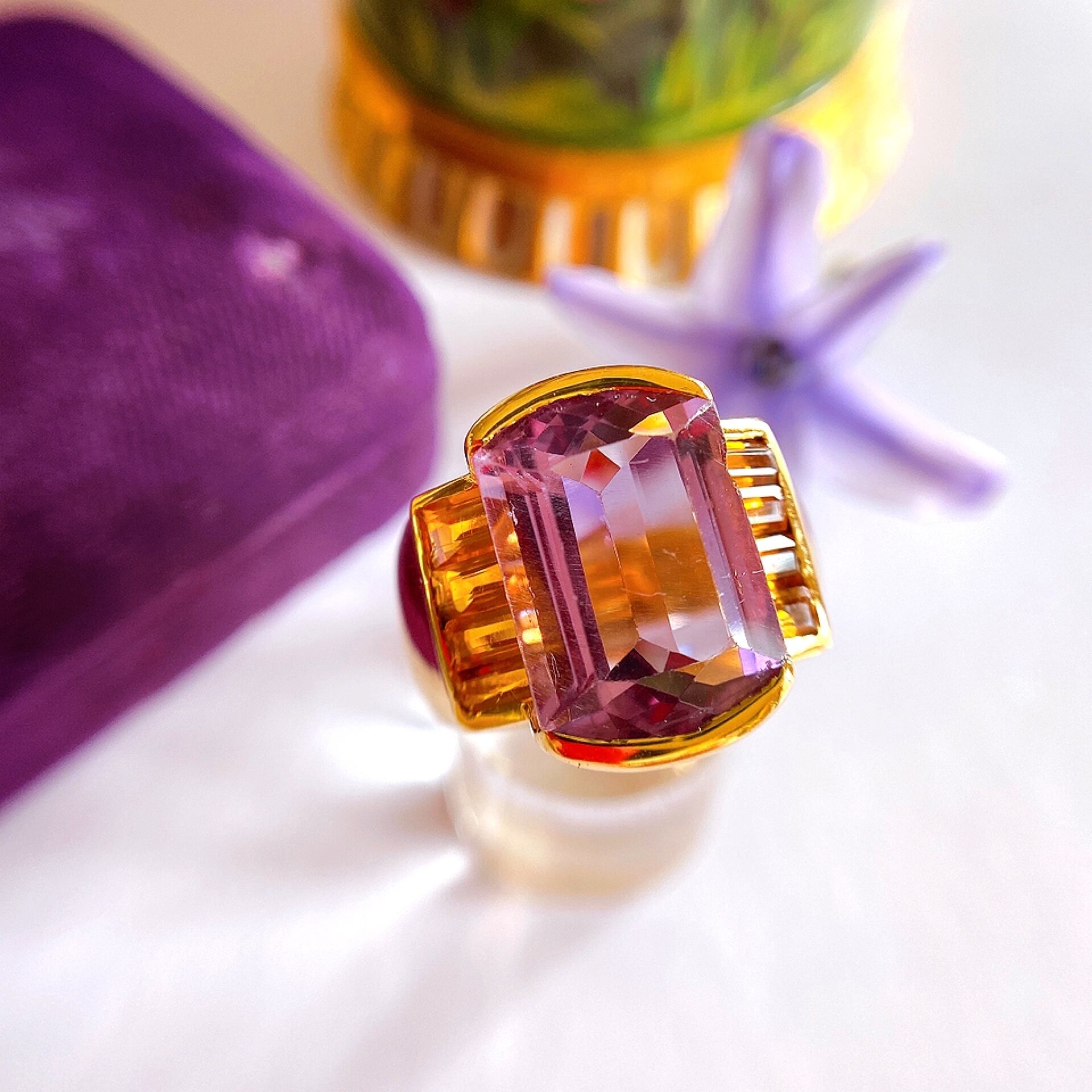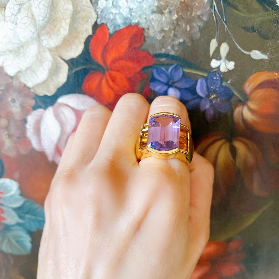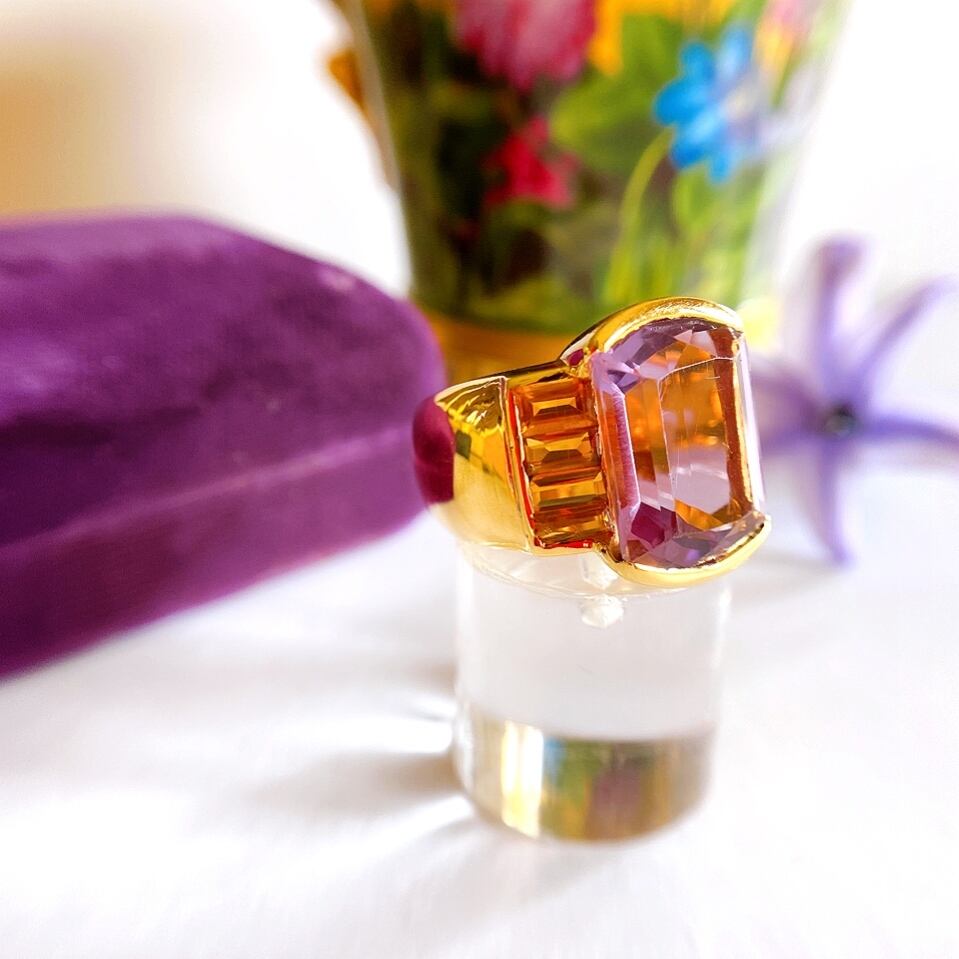 吸い込まれそうなスミレ色の16mmのアメシストは長方形でも両端が緩やかに丸みを帯び、その両隣りには蜂蜜のような黄金色の4mmのステップカットシトリンが4石隙間なくセットされた、見事にスタイリッシュなひと品です。