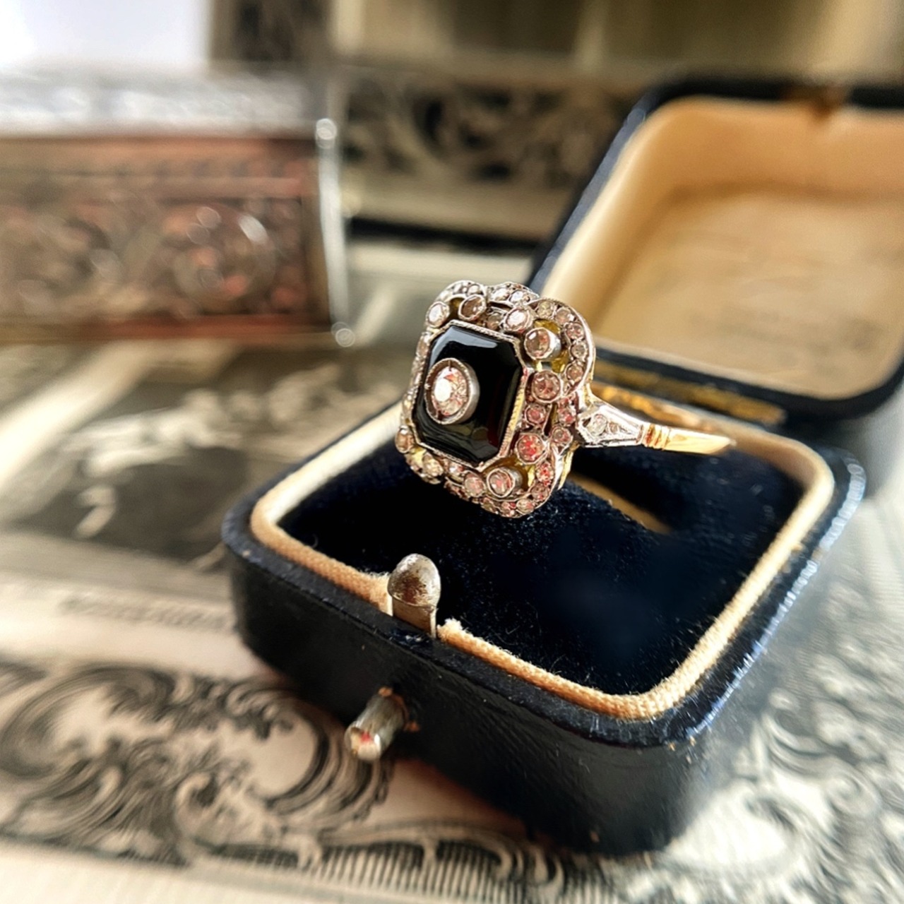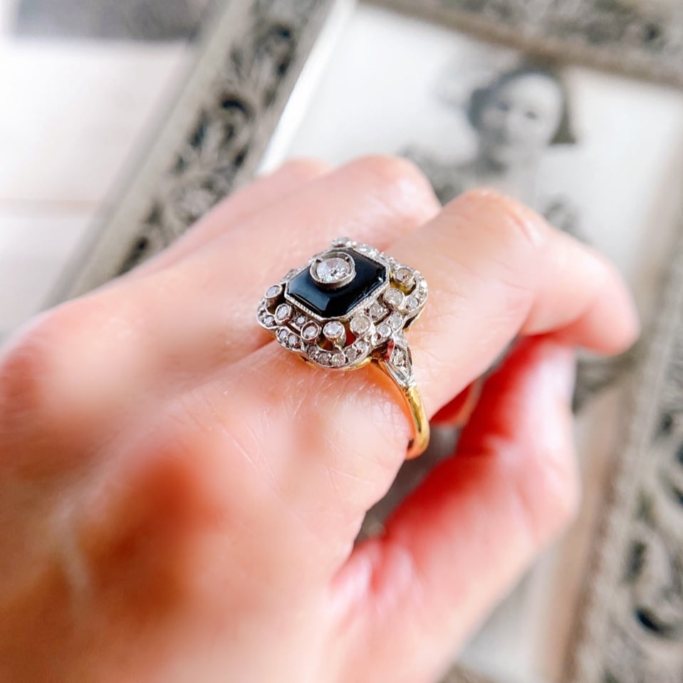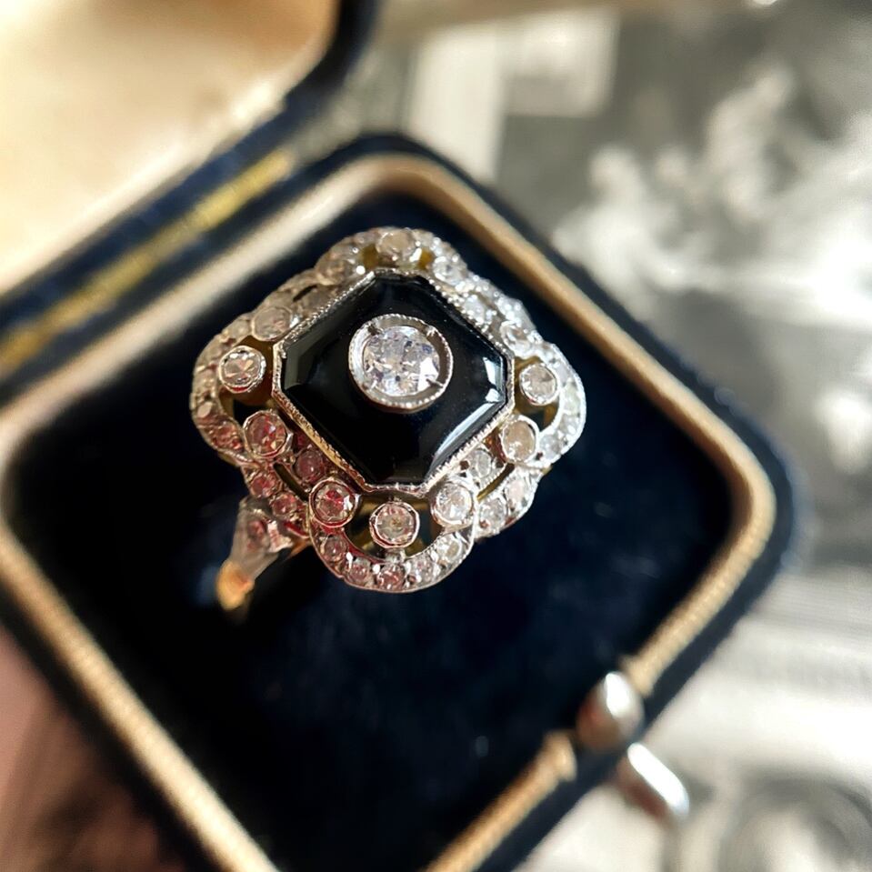 オニキスの黒とダイヤモンドの白の輝きの組み合せはアールデコ時代によく使用されてきましたが、こちらのリングはこの容姿からその時代よりほんの少し前の1910年頃のエドワーディアンのお品とおもわれます。