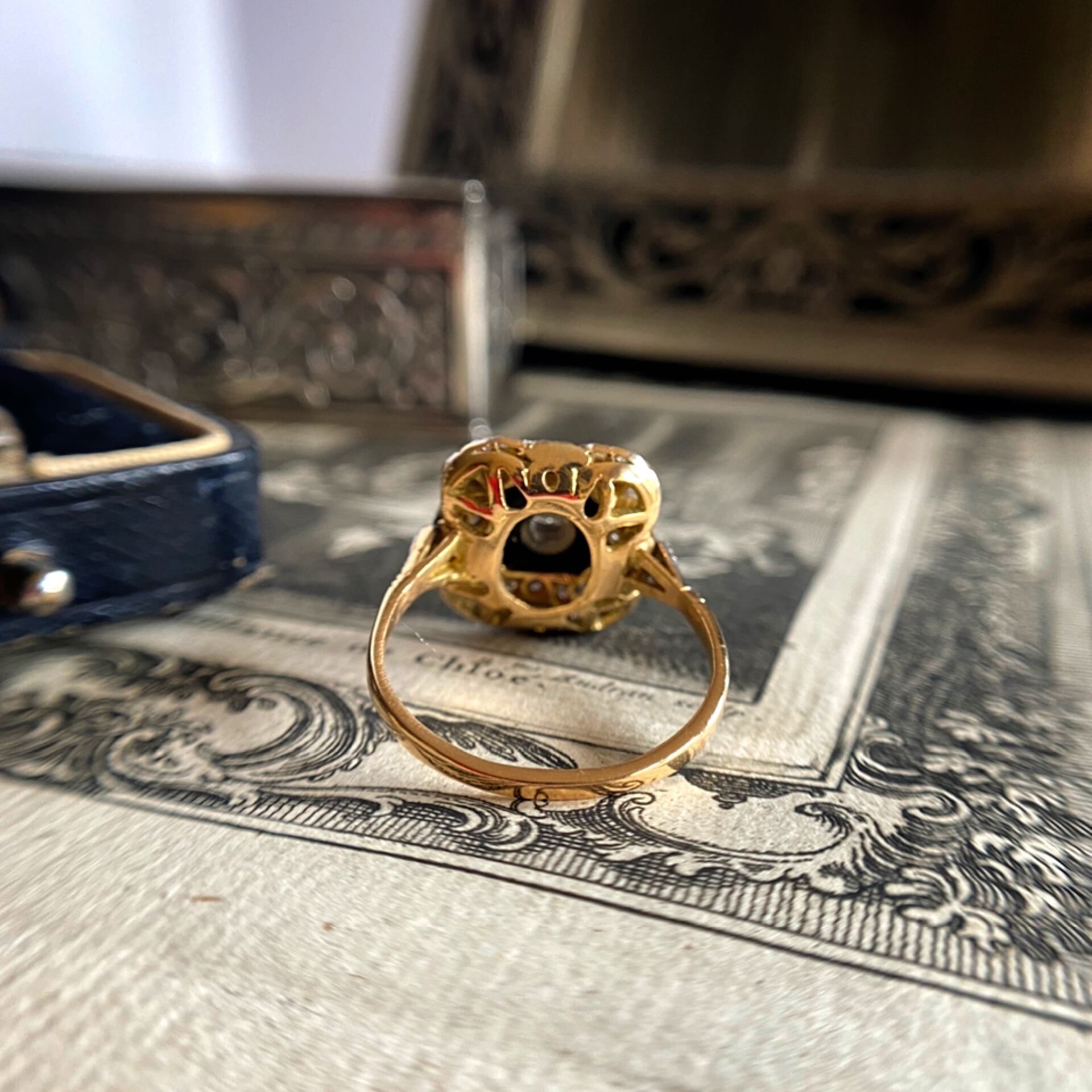 高低差をつけ立体感をもたせ、ボーダーは緩やかなフリルデザインになっています。きっとこちらがアールデコのリングですともっとスッキリとしたクール感が強調された物になっていたと思います。でもこちらはエドワーディアンらしい、貴族的な優美な印象をこの取り巻きのデザインが発揮してくれているのです。