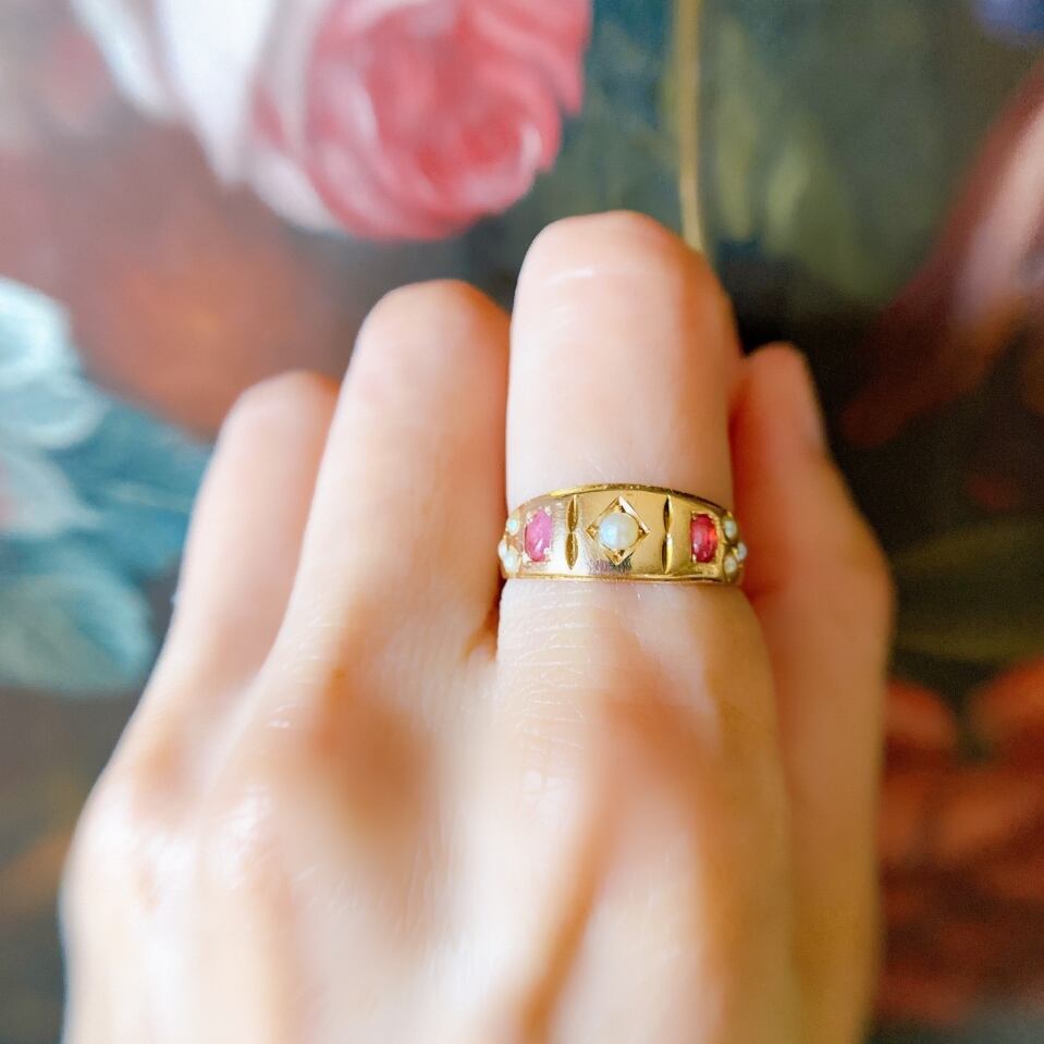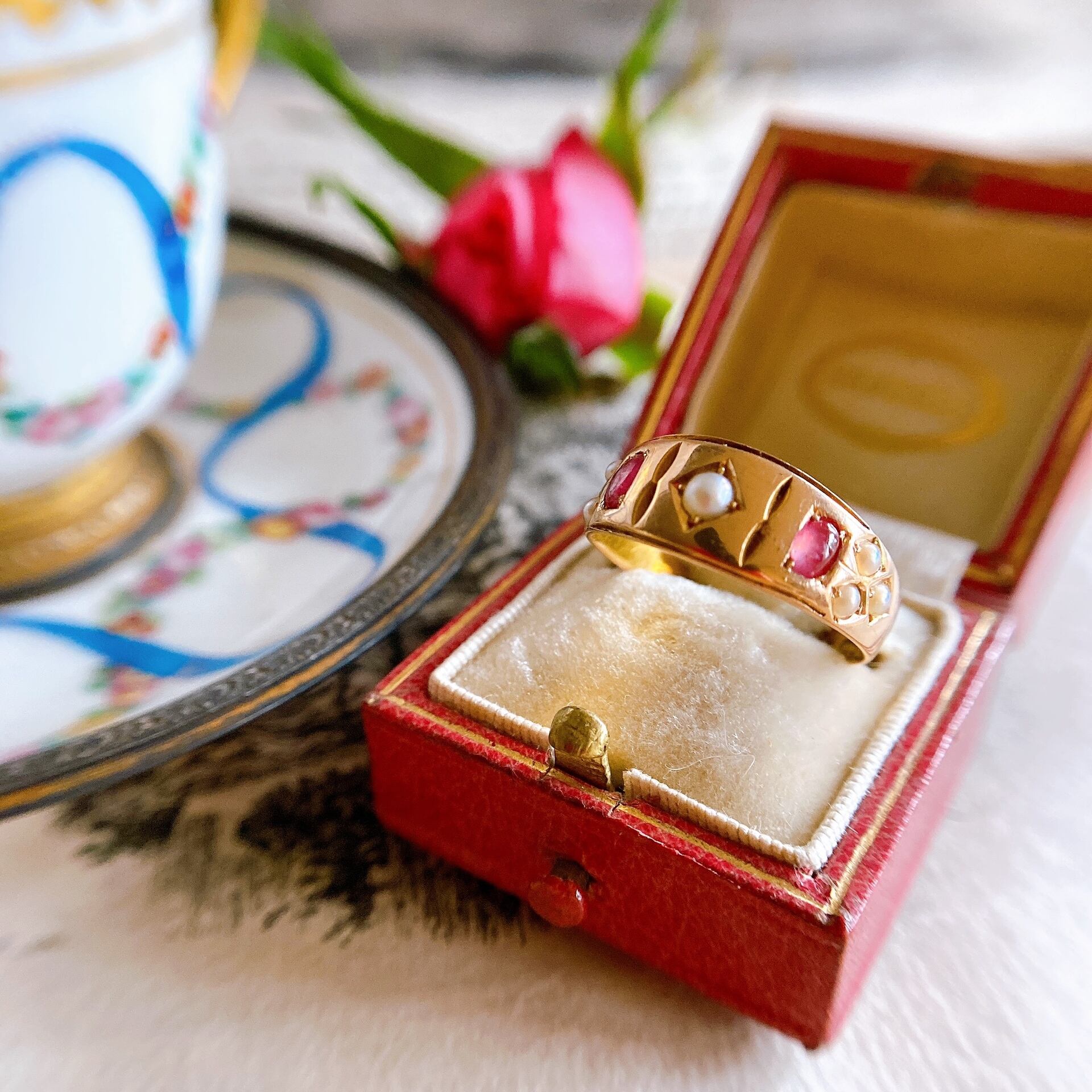 ゴールドの輝きの中に佇むハーフパールのやさしい輝きを中心に、ピンキッシュなカボションカットルビーがアクセントとなったヴィクトリアンジプシーセッティングリング。