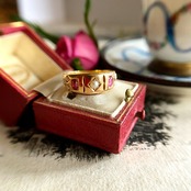 このようにリングに宝石が埋め込まれたデザインのリングをジプシーセッティングリングといい、ヴィクトリア時代中頃のおしゃれなデザインの一つでした。