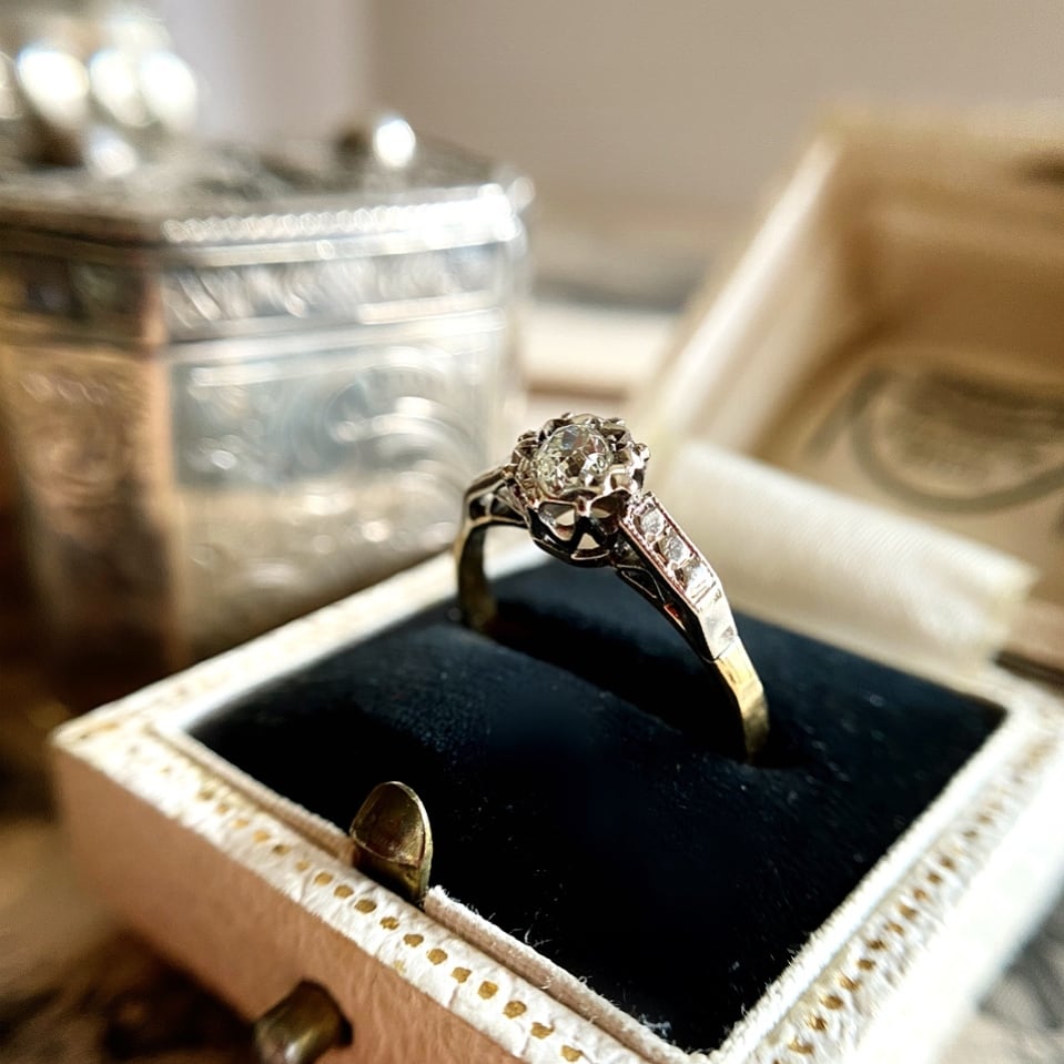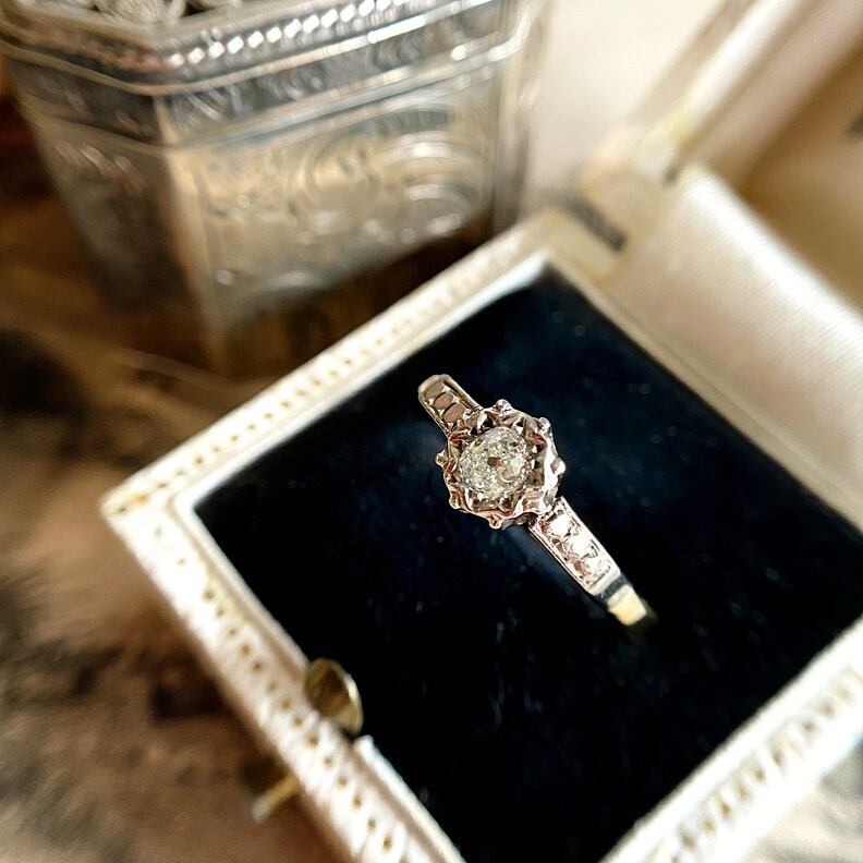またダイヤモンド自体もオールドカットの特徴でもあるキュレットを大きくカットしていることによる真丸おめめが見え、ダイヤモンドの中心部にまるで大きな穴が開いているように見えるというアンティークのダイヤモンドの特徴がはっきり出ているとても美しいひと品です。