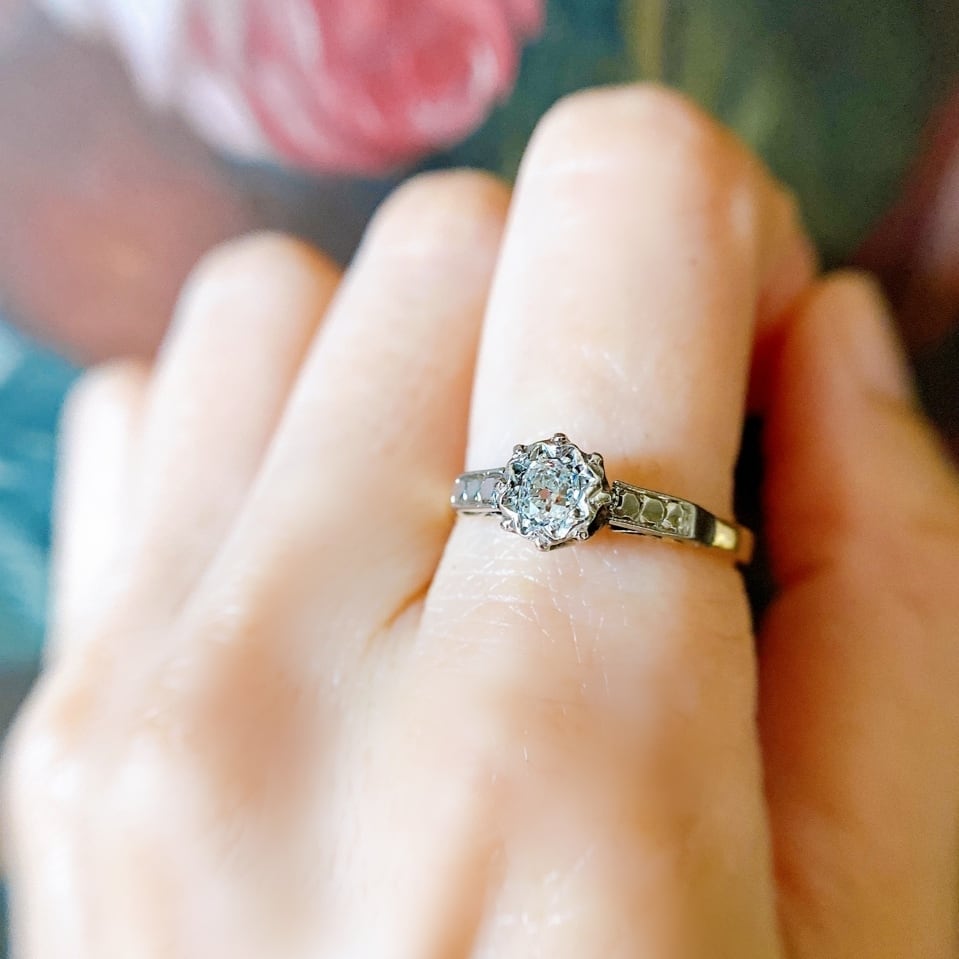 星の輝きを表現したかのような後光を彫金したプラチナの台座の中にすっぽりとひとかけらの星のようにオールドマインカットダイヤモンドをセットした美しいエドワーディアンのソリテールリング。