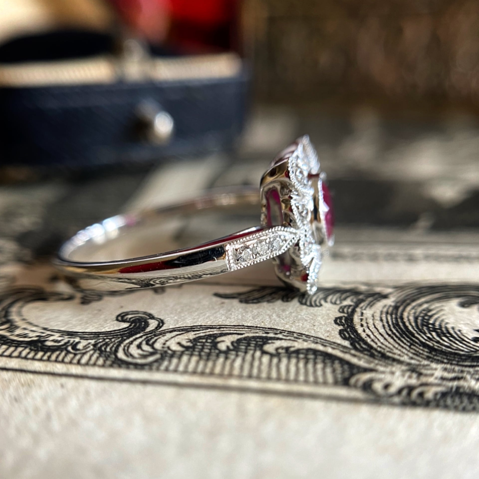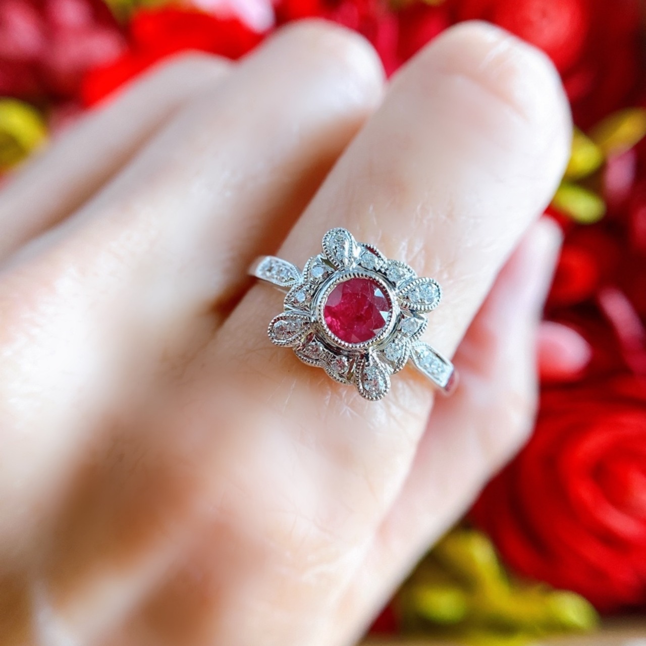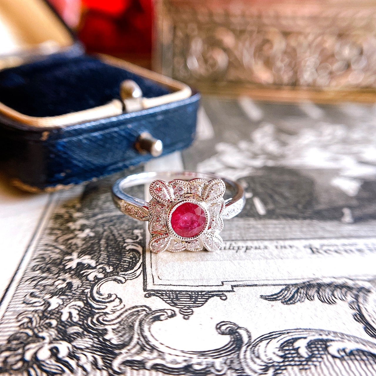 ホワイトゴールドの四角いお花のフェイスの中央に鮮やかな非加熱ルビーをセットし、花弁には小さなメレダイヤモンド、そして全てのアウトラインには細やかなミルグレインが施され、光を集めてそれぞれ自由気ままに輝く様子についつい手元を見てしまうリングです。