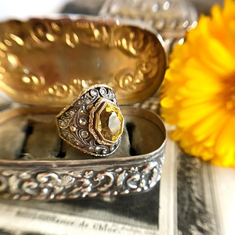 とろんと黄金色に輝くシトリン、その周りのアカンサスデザインを透し彫りにしたフェイスにセットされた粗削りのローズカットダイヤモンド、本当に見応えのあるリングのご紹介です。