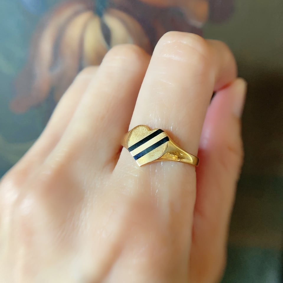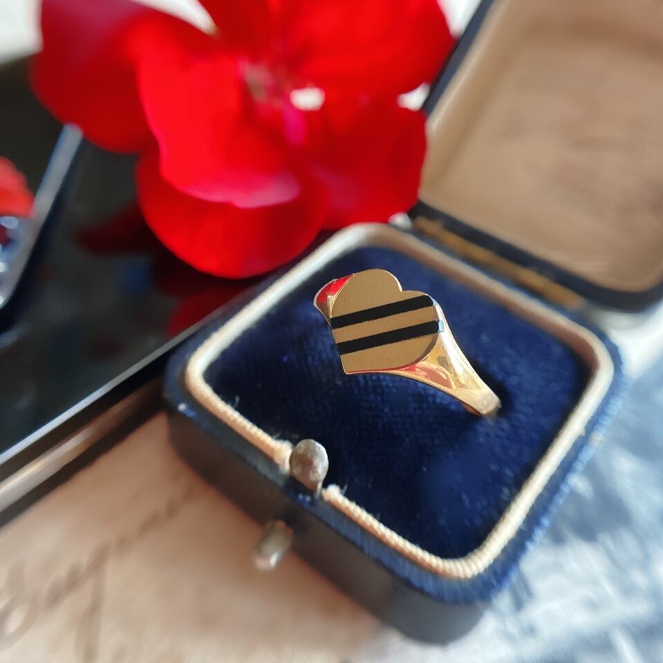 ゴールドのハートのフェイスにキリッとしたブラックのストライプのメリハリが素敵なフォーティーズリングのご紹介です。