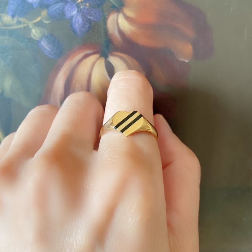 ゴールドの艶感がキラリとしたフェイスに2本溝を作り、そこにブラックオニキスを嵌め込んだ、象嵌つくりのリングです。象嵌とは一つの素材に異質の素材を嵌め込む事をいい、一見シンプルながらも実に手の込んだ作りになったひと品はアールデコからモダンへ以降した当時の面影を色濃く感じる事ができます。