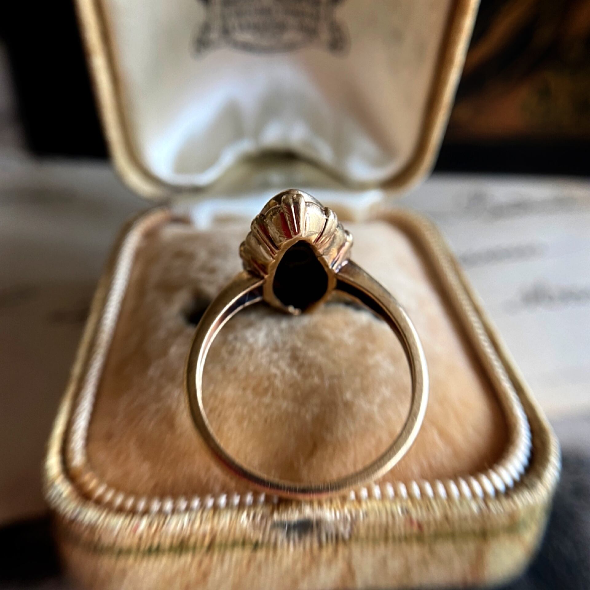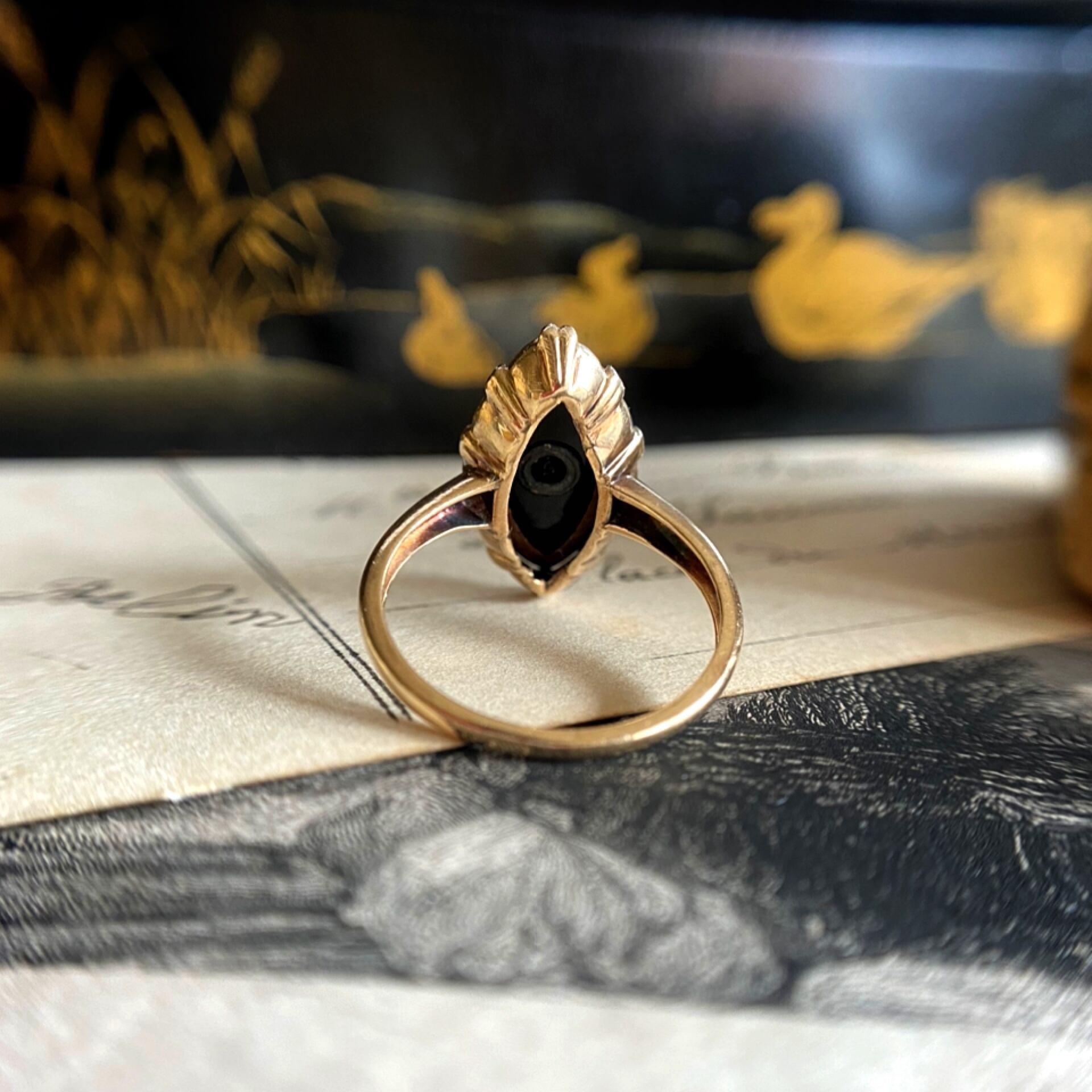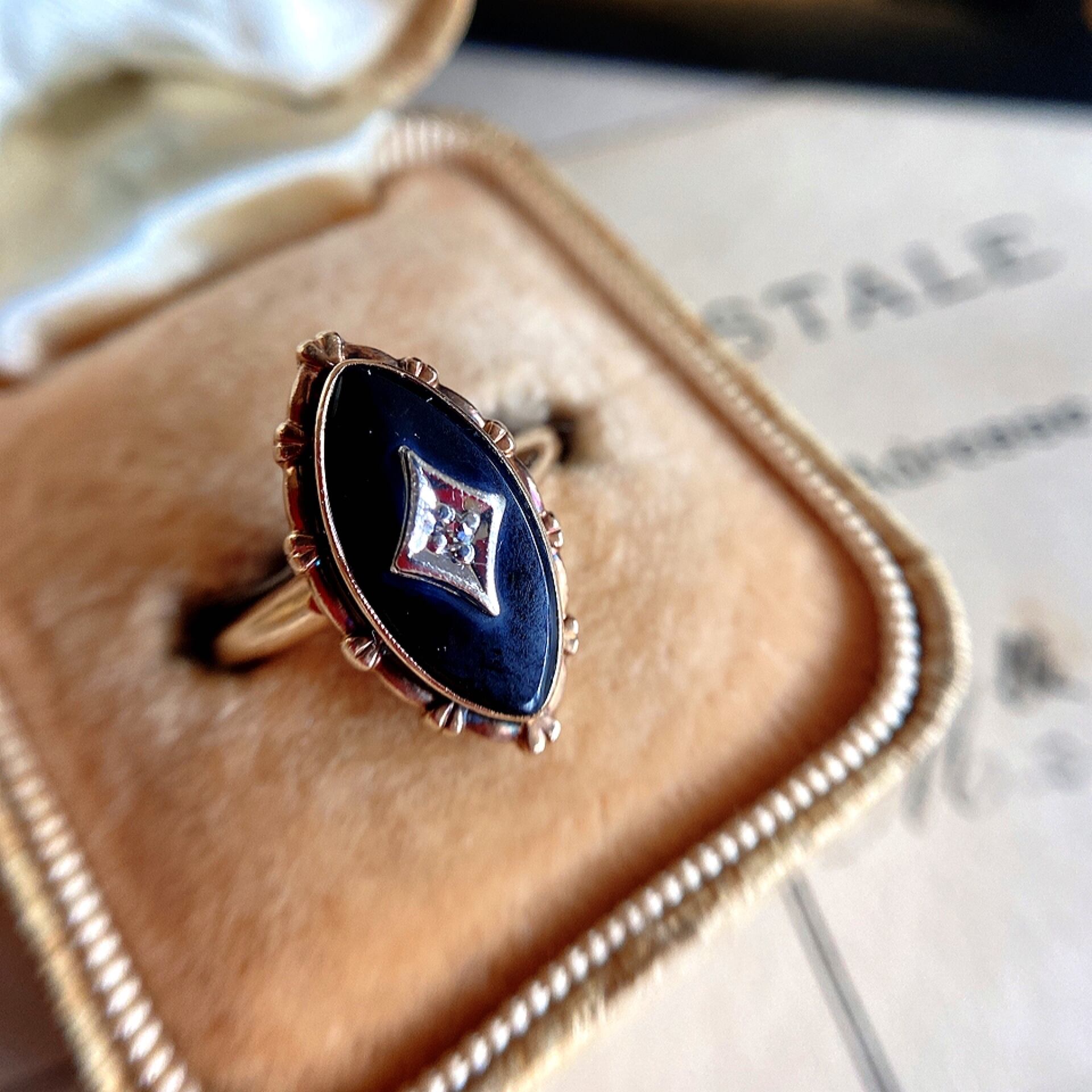 マーキーズシェープにカットされたブラックオニキスは漆黒の夜空を思わせ、中央には小さく輝く星屑のようなダイヤモンド、そんな静けさを感じるアールデコリングのご紹介です。