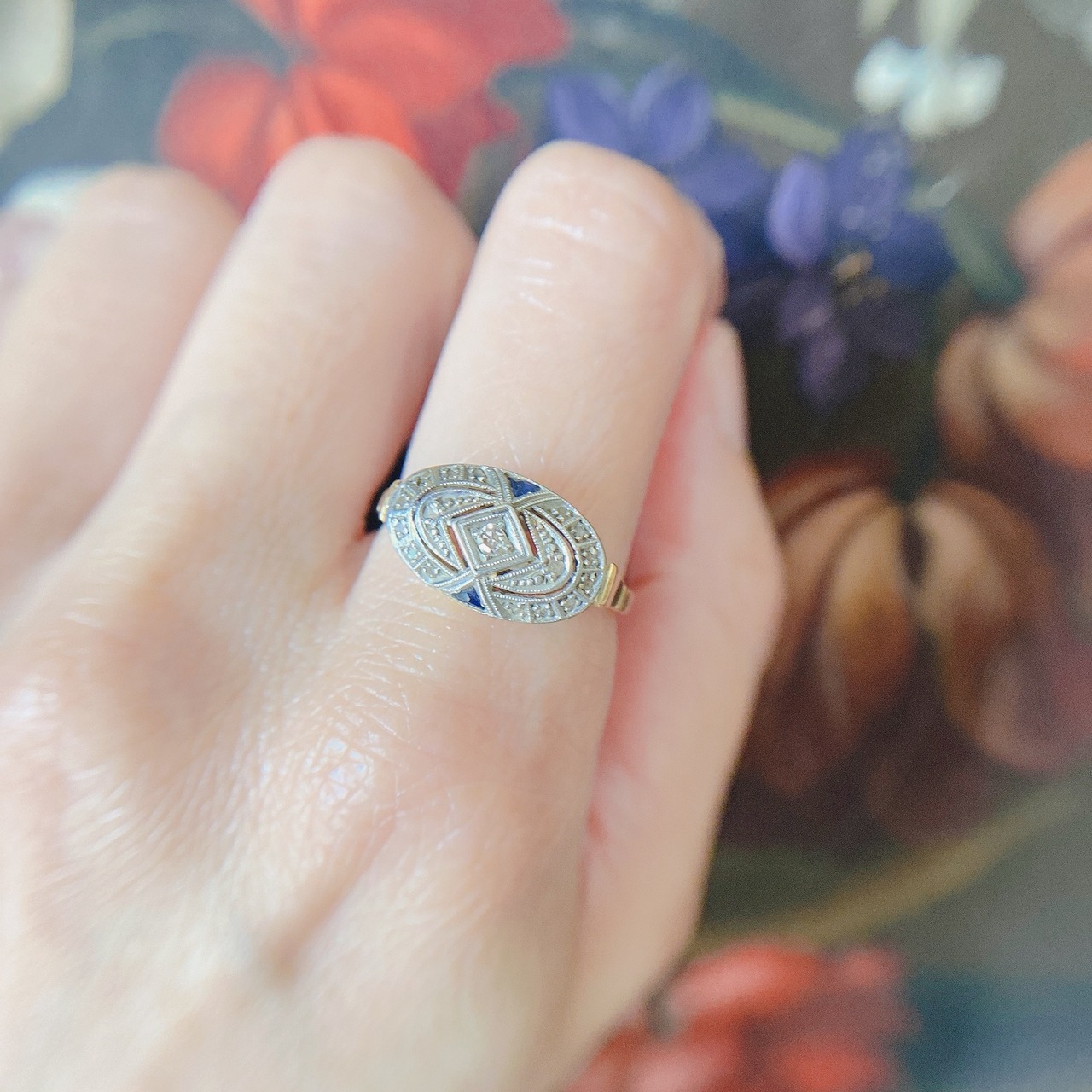 幾何学的なアールデコのカッコ良さを感じるオーバルシェープのダイヤモンド&サファイアのリング。