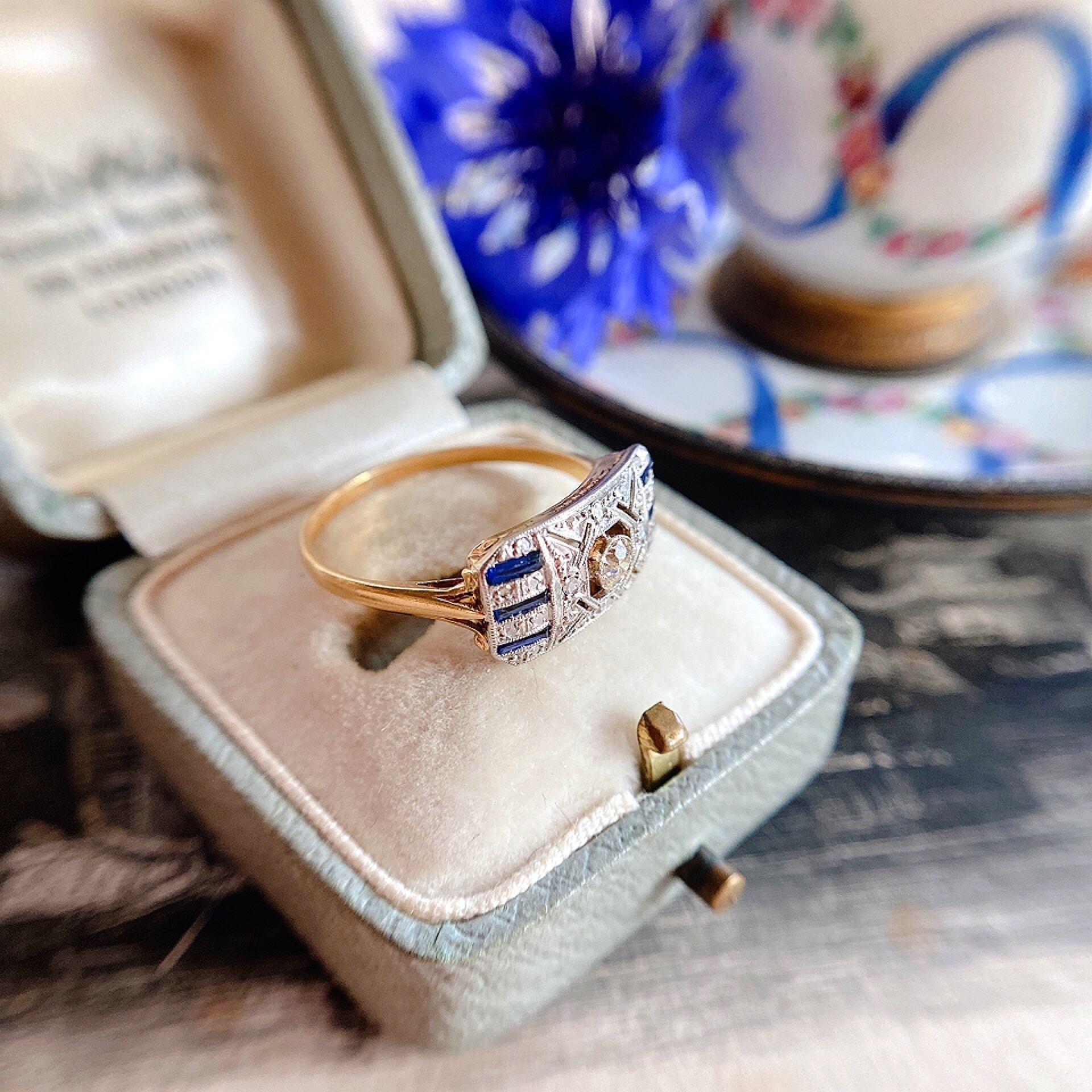透し彫り、ミルグレイン、カリブレカットサファイア、オールドヨーロピアンカットダイヤモンド、小さな長方形のフェイスにその全てが詰まった繊細な美しさを放つアールデコリング。