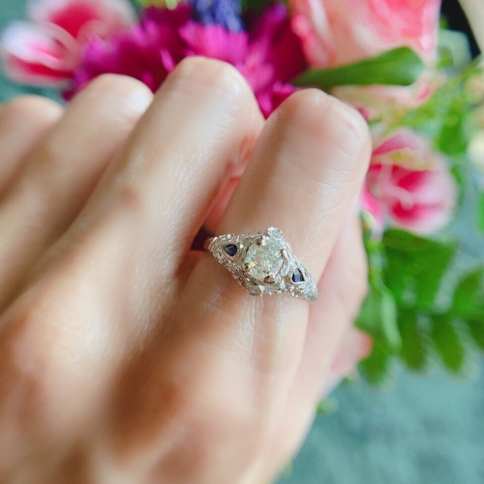 透明度に優れ、コロンと四角いオールドマインカットダイヤモンドのシルエットが頂点に煌くレーシーなリング。