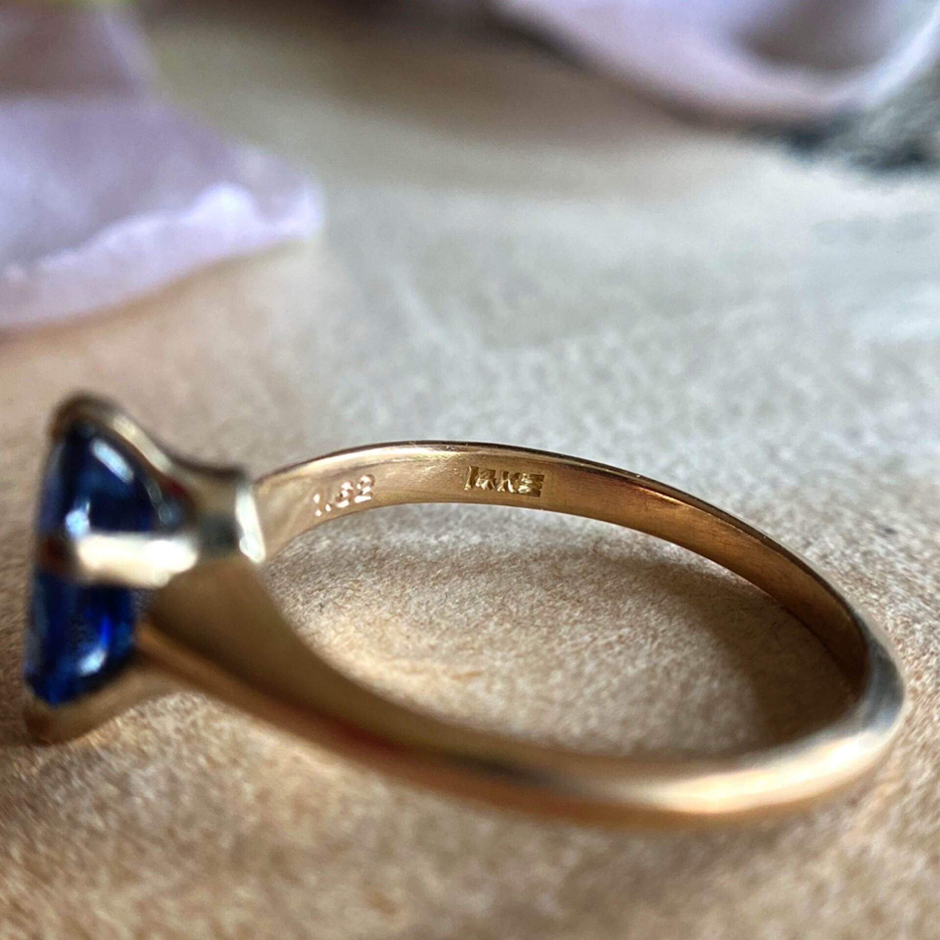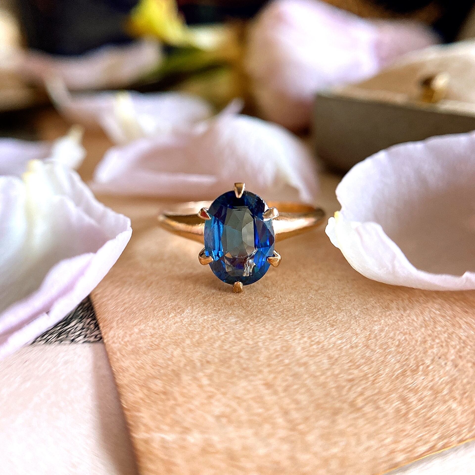 サファイアは持ち上げられるように、アンティークならではの細身の爪にセットされ、明るく光を取り込み、アーム、台座に一切装飾がなくシンプルな作りだからこそ、石がより一層引き立てられ、ブルーサファイアの色みを純粋に愉しめるシンプルで飽きのこないデザインになってます。
