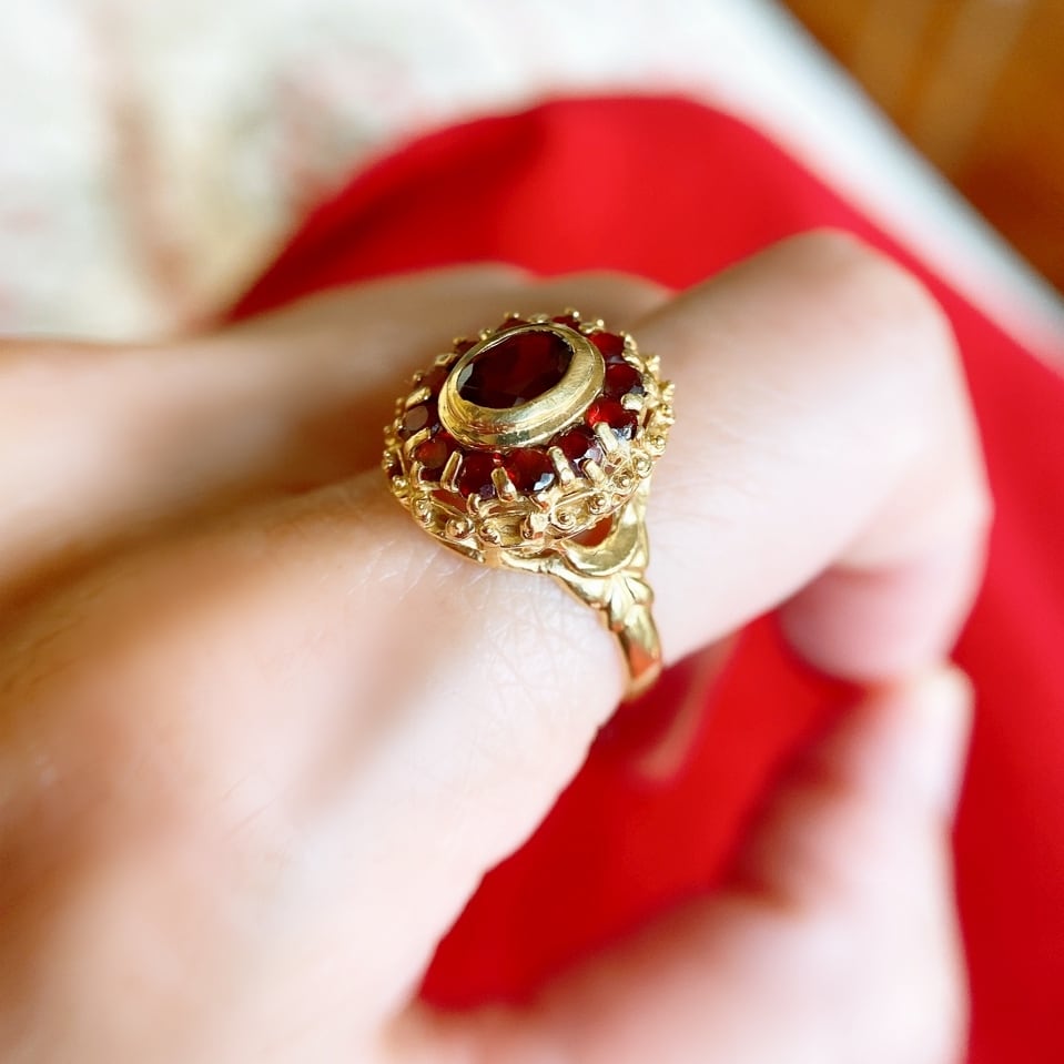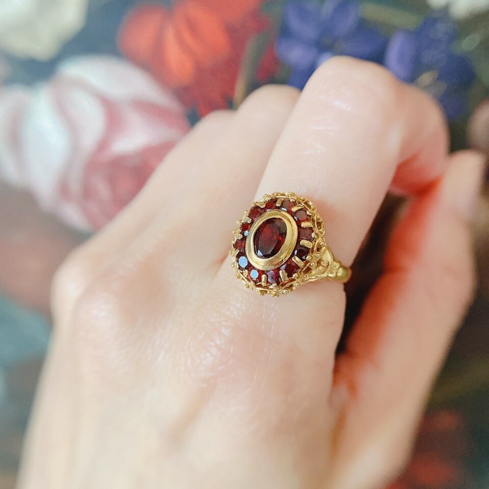 アンティークテイストが漂う、燃えるような赤のヴィンテージガーネットリング。妖艶な美しさの中にも丸みのあるコロンとした可愛さもあり、年齢を超えて身に付けて頂けるひと品です。