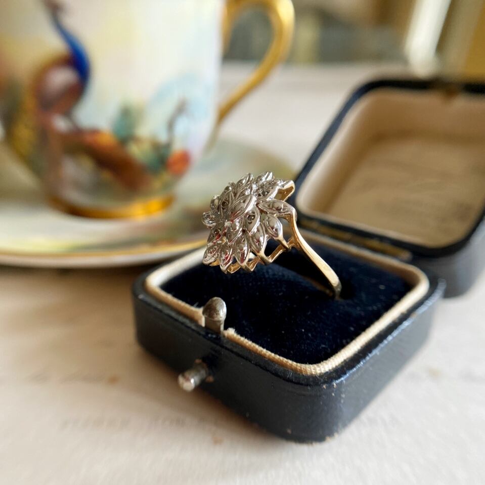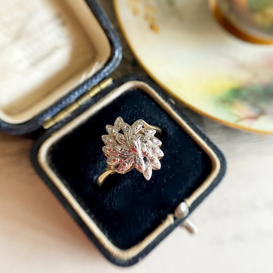 まるで小さな鳥が羽をいっぱい広げて飛ぶ瞬間をデザインしたような、羽根が幾重にも重なっているような個性的なデザインのヴィンテージリング。