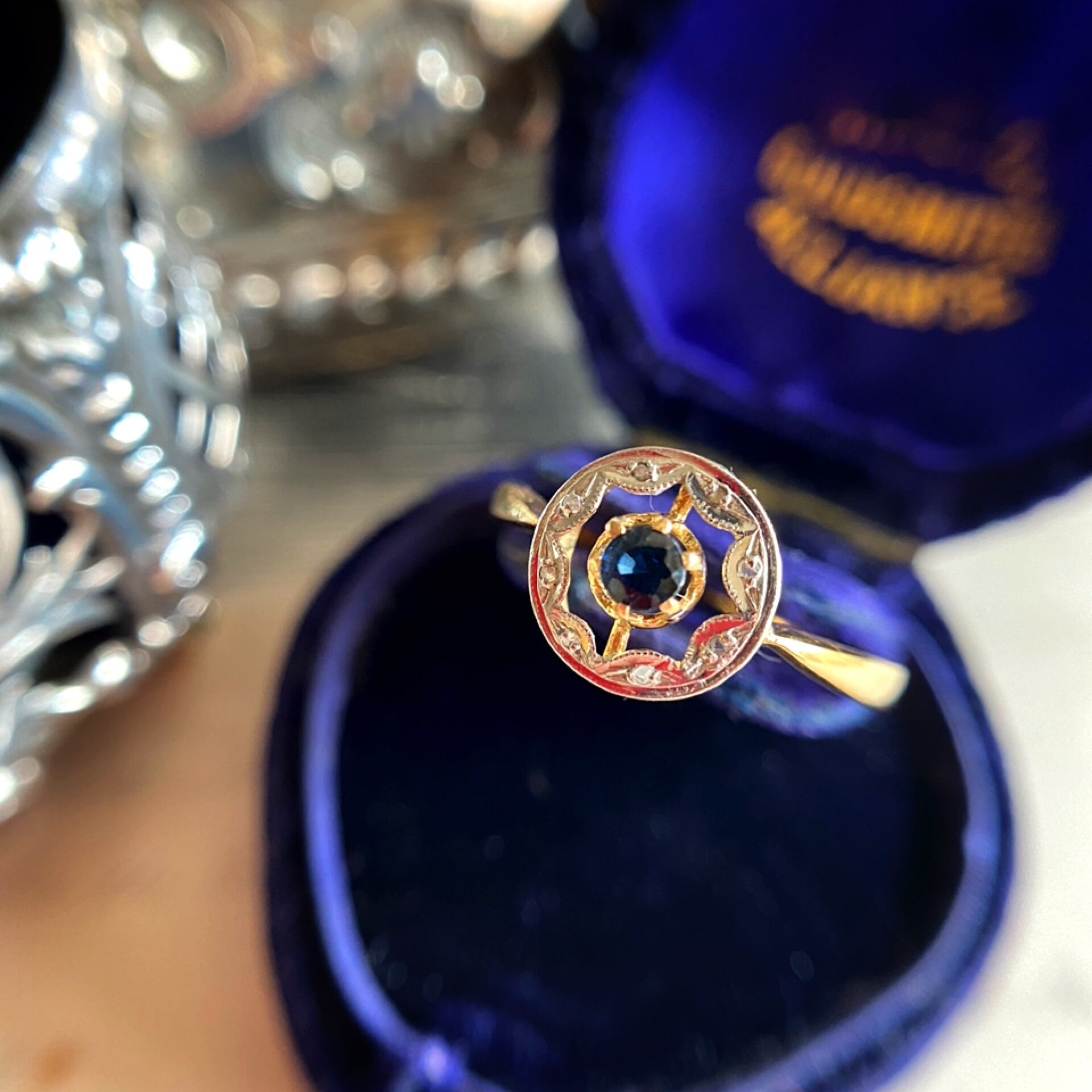 ゴールドの台座の透かしも軽やかで可愛らしく、一見するとシンプルに見えるアール・デコ特有の美が宿っているリングです。