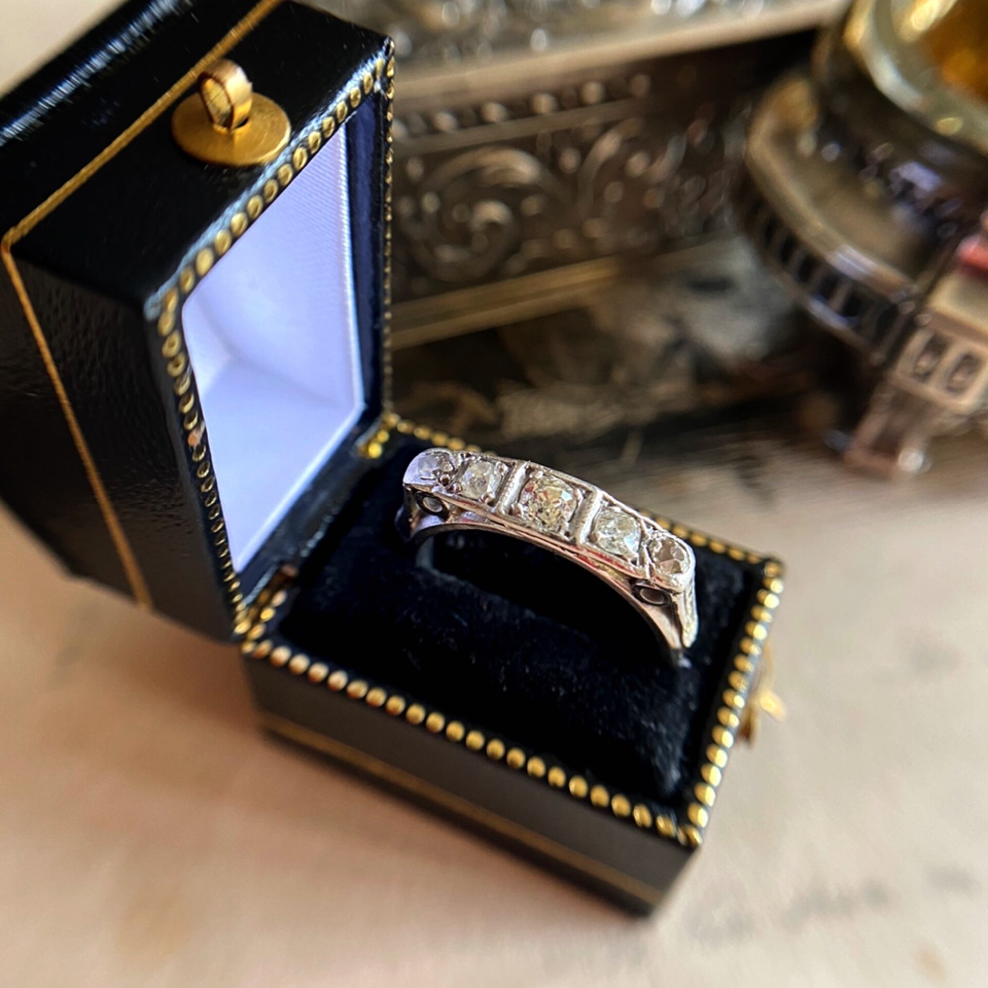 すっきりとシンプルな長方形のフェイスに正方形で小窓を作り、それぞれにの瑞々しいオールドマインカットダイヤモンドをセットしたアール・デコのファイブストーンリング。