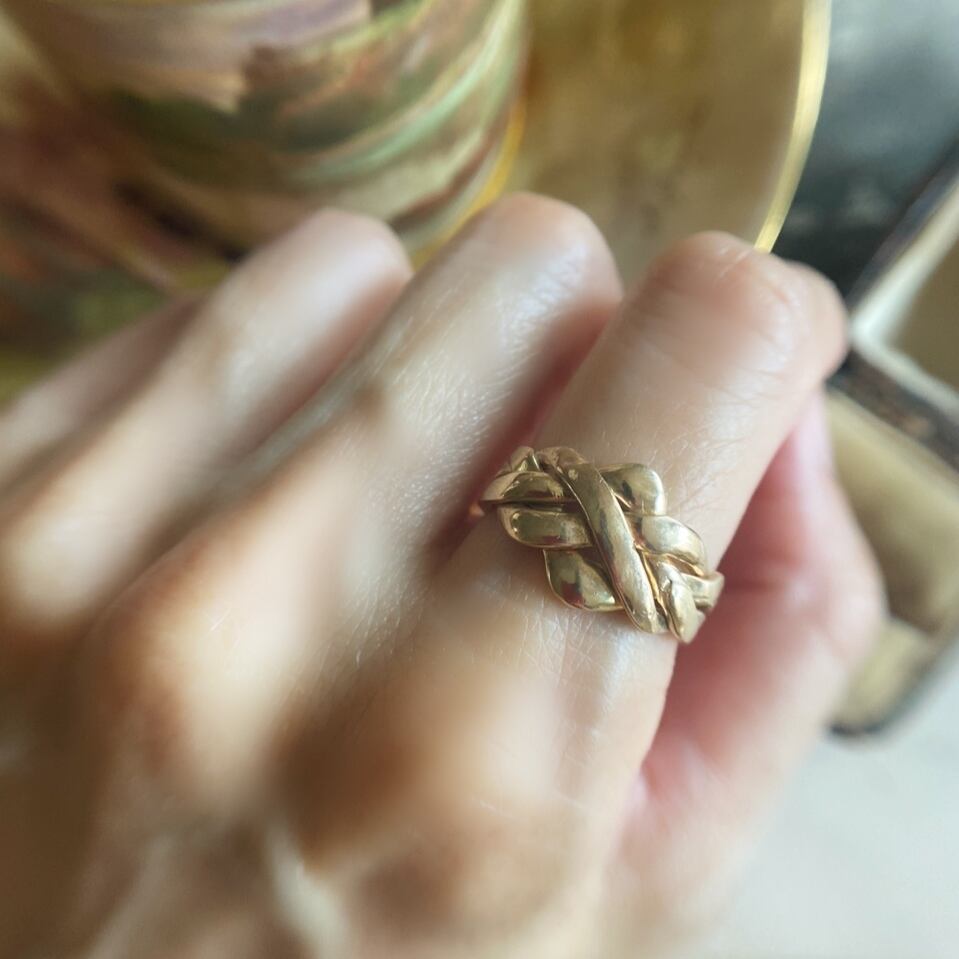 ゴールドの絡み方が編み込みのように重なり、それが金属で出来ているとは思えない滑らかなテクスチャー、