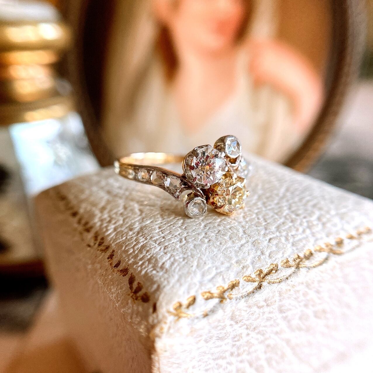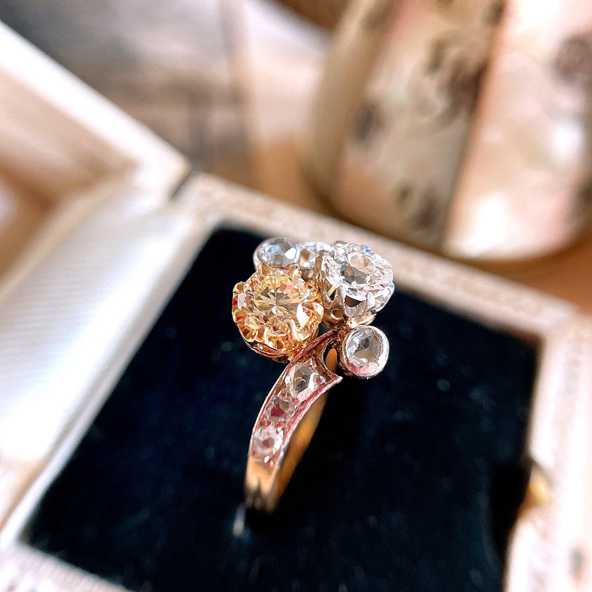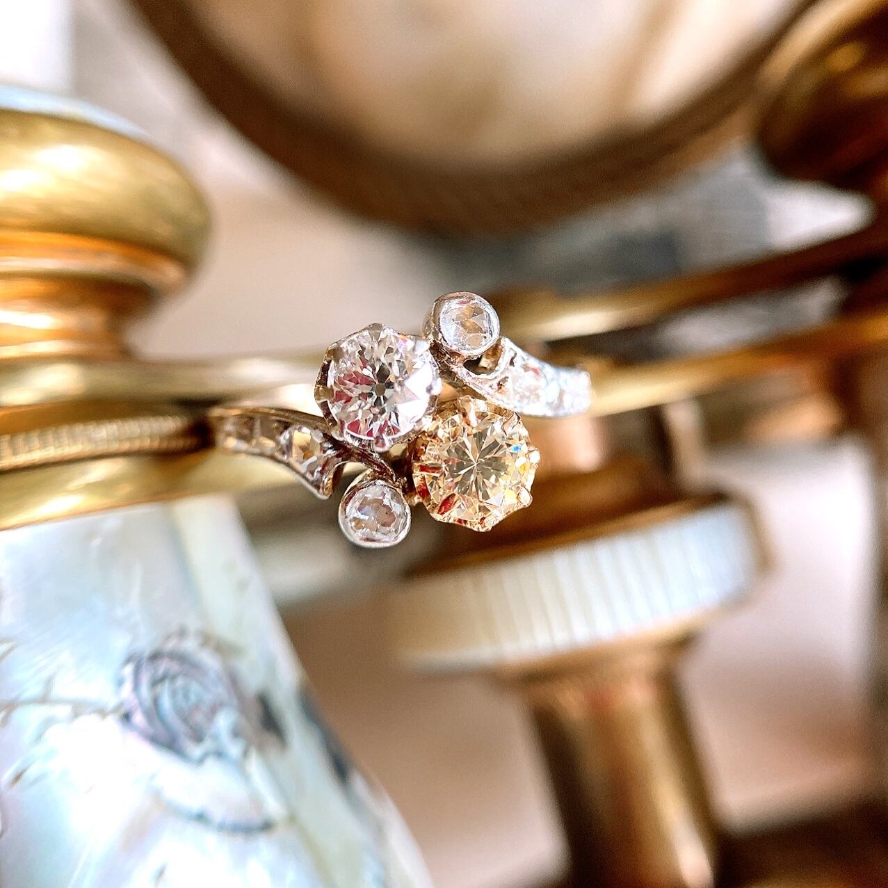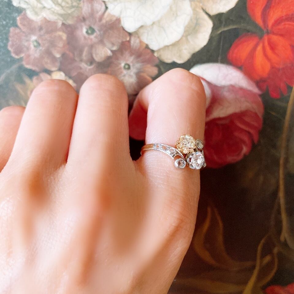 ゴールドの台座にはほんのりレモン色に色づいたイエローダイヤモンド、もう一方のプラチナの台座にはクリアーなダイヤモンドをセットした「トワ・エ・モア」つまり「貴方と私」という2つ並んだ石を恋人同士になぞらえたデザインを示す20世紀初頭に流行したリングです。