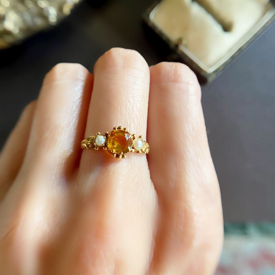 小さなハーフパールをサイドに添えて、中央にはトロンとしたオレンジ色のシトリンをこんなにも可愛く収める、なんともヴィクトリアンらしいひと品のご紹介です。