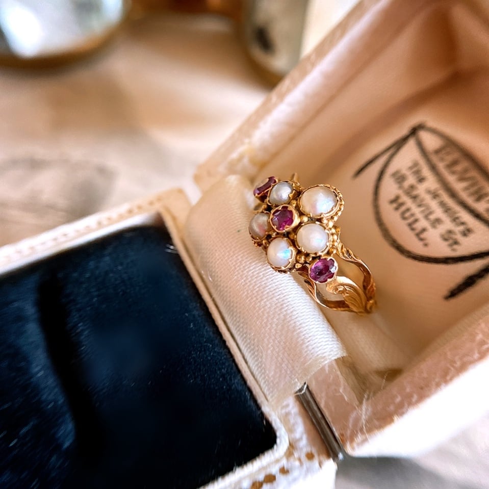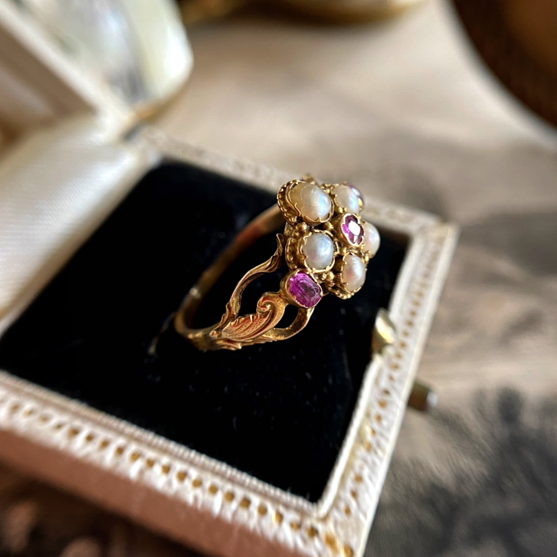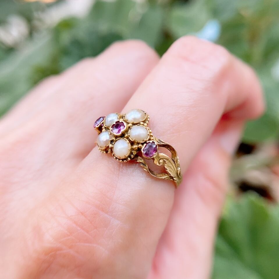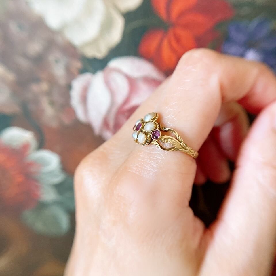 勿忘草 ハーフパール&ナチュラルルビーのヴィクトリアンリング